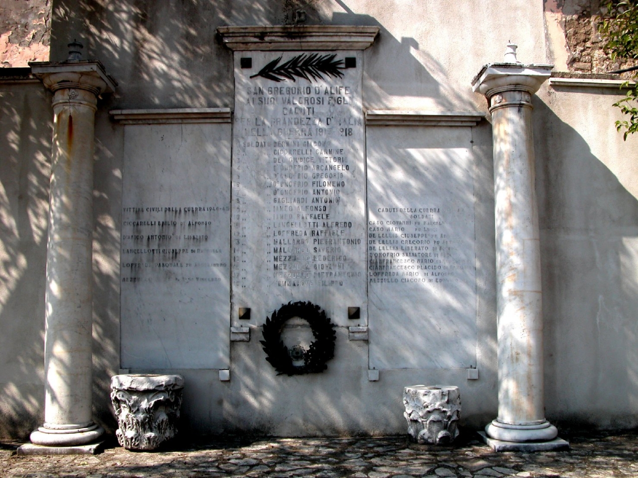 - ISCRIZIONI lapide centrale/ nel campo - SAN GREGORIO D'ALIFE/ AI SUOI VALOROSI FIGLI/ CADUTI/ PER LA GRANDEZZA D'ITALIA/ NELLA GUERRA 1915-1918/ 1 SOLDATO BERMINI GIACOMO/ 2 ‘’ ‘’ CICCARELLI CARMINE/ 3 ‘’ ‘’ DEL GIUDICE VITTORIO/ 4 ‘’ ‘’ D’ONOFRIO ARCANGELO/ 5 ‘’ ‘’ D’ONOFRIO GREGORIO/ 6 ‘’ ‘’ D’ONOFRIO FILOMENO/ 7 ‘’ ‘’ D’ONOFRIO ANTONIO/ 8 ‘’ ‘’ GAGLIARDI ANTONIO/ 9 ‘’ ‘’ IAMEO ALFONSO/ 10 ‘’ ‘’ IAMEO RAFFAELE/ 11 ‘’ ‘’ LANGELLOTTI ALFREDO/ 12 ‘’ ‘’ LOFFREDA RAFFAELE/ 13 ‘’ ‘’ MALLARDO PIETRANTONIO/ 14 ‘’ ‘’ MALLARDO SAVERIO/ 15 ‘’ ‘’ MEZZULLO FEDERICO/ 16 ‘’ ‘’ MEZZULLO GIOVANNI/ 17 ‘’ ‘’ MEZZULLO PIETRANTONIO/ 18 ‘’ ‘’ TOMMASONE FILIPPO// - lettere capitali - a incisione - italiano