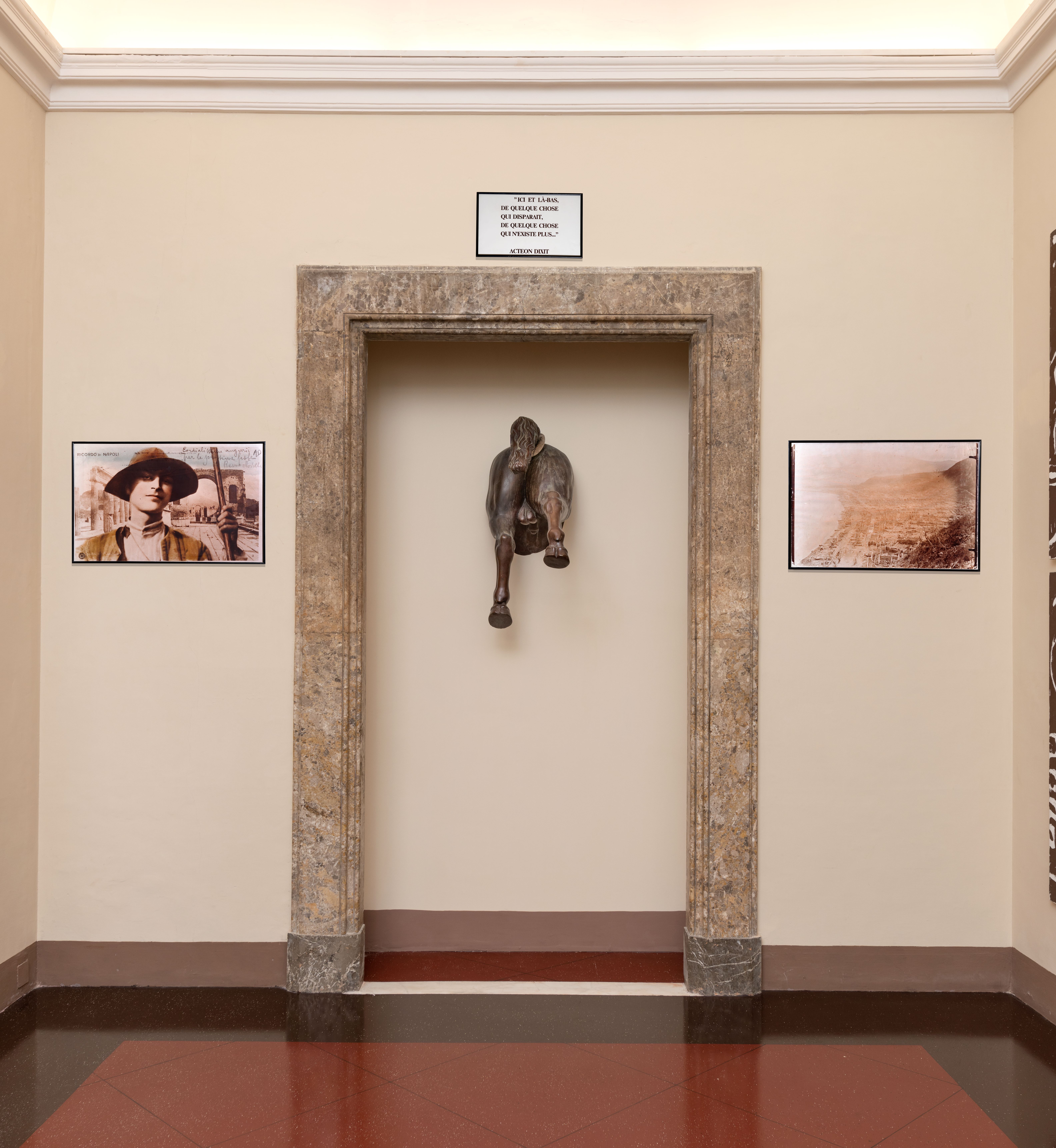 L’installazione a parete di Alberola dal titolo “1907” - una data che fa probabilmente riferimento al terremoto che colpì la Calabria - è composta da quattro parti che, sotto forma di frammenti isolati, compongono un’unica scena e/o storia che travalica il tempo passato e che si offre a chi guarda come una combinazione di enigmi da risolvere, sintetizzati in un testo scritto dall’artista: "Ici et là-bas, de quelque chose qui disparait, de quelque chose qui n’existe plus…”(Qui e laggiù, di qualcosa che sparisce, di qualcosa che non esiste più...), a firma di Acteon dixit. Atteone è l’alter ego di Alberola, in genere riportato in latino. “1907” è composta anche dall’ingrandimento della cartolina "Ricordo di Napoli" che raffigura un pastorello con alle spalle una veduta delle rovine di Pompei; dalla forma scultorea di un cavallo di cui è mostrata solo la parte posteriore, perché il resto del corpo è nascosto al di là del muro e, infine, dalla foto aerea di un paesaggio (probabilmente la linea costiera al di sotto del Vesuvio) completamente distrutto da un evento naturale