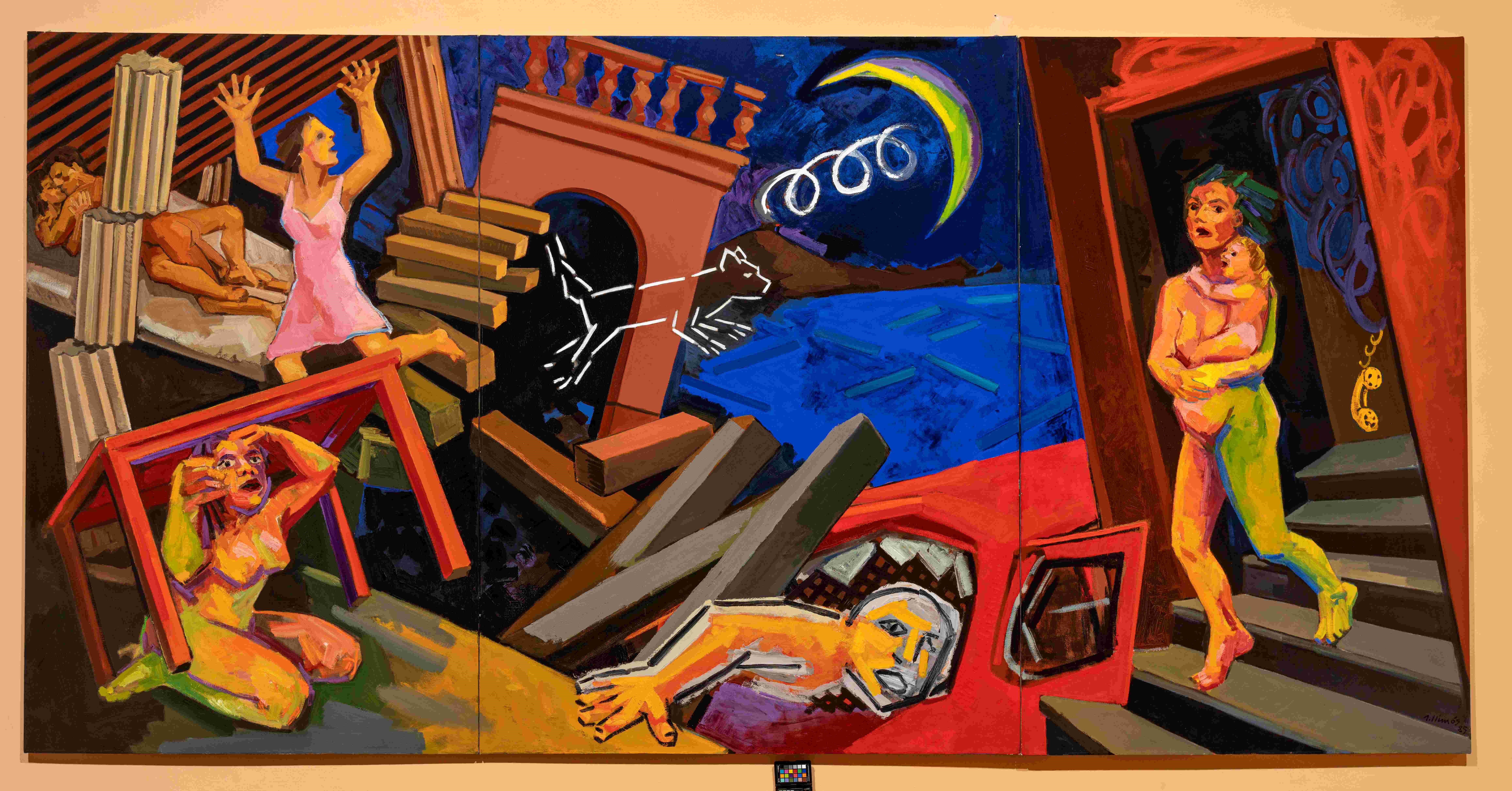 Il grande dipinto di Llimòs trae ispirazione dal terremoto del 1980 che viene rappresentato dall'artista catalano in una veduta notturna con una mezzaluna, nella quale case e archiettture traballano e sono in bilico, così come le figure umane sono prese alla sprovvista e terrorrizate dalla forza della natura. Al centro della scena è disegnata la silhouette di un gatto "E' un'immagine aggressiva e mobile che oscilla tra la vita e la morte, che simboleggia anche le sette vite del felino, che è come dire la lotta continua per la sopravvivenza"