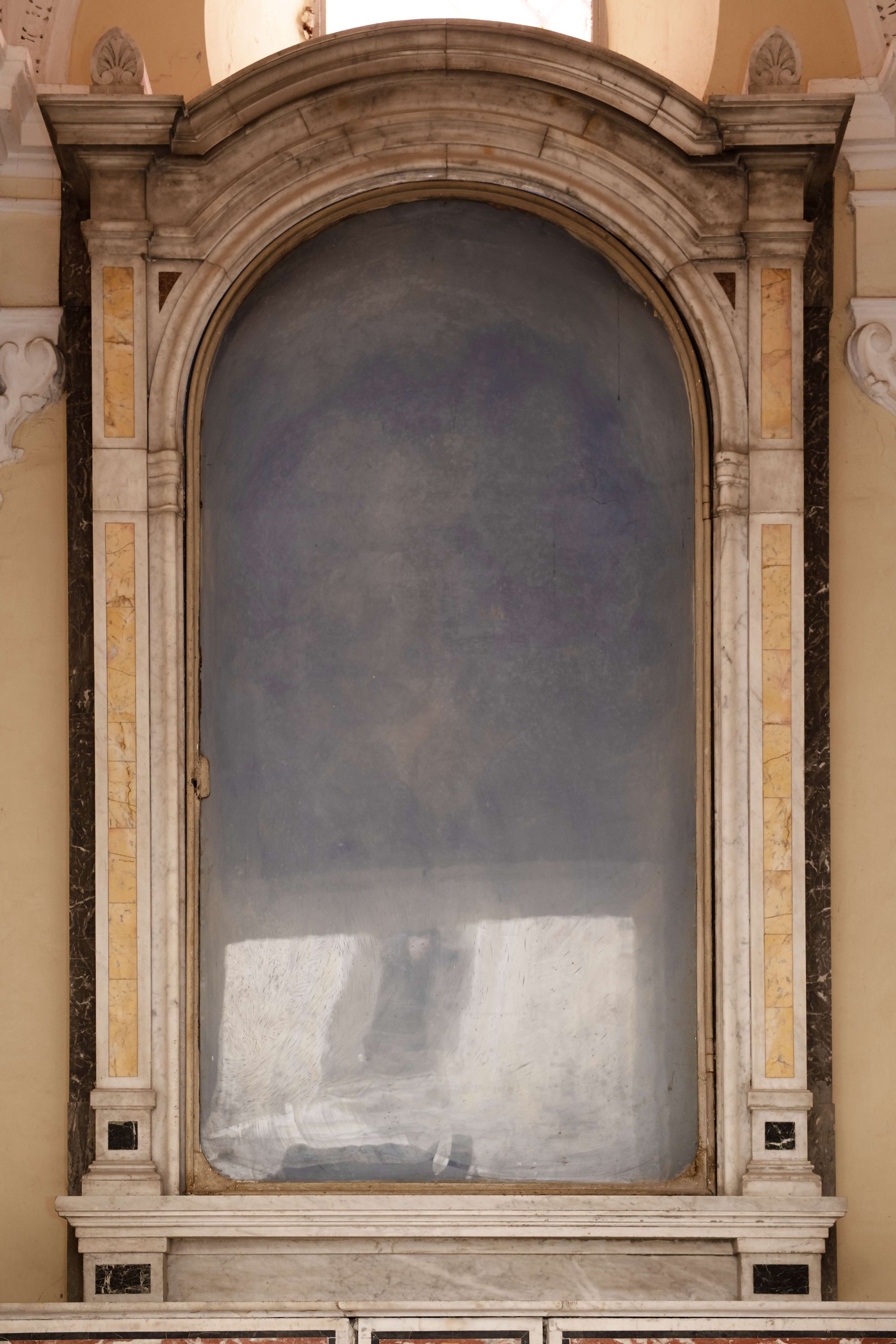 L'edicola si compone di una cornice a specchiature in marmo giallo conclusa ad arco a tutto sesto, decorato ai lati da due acroteri. Al centro, un vetro proteggeva probabilmente un'icona votiva