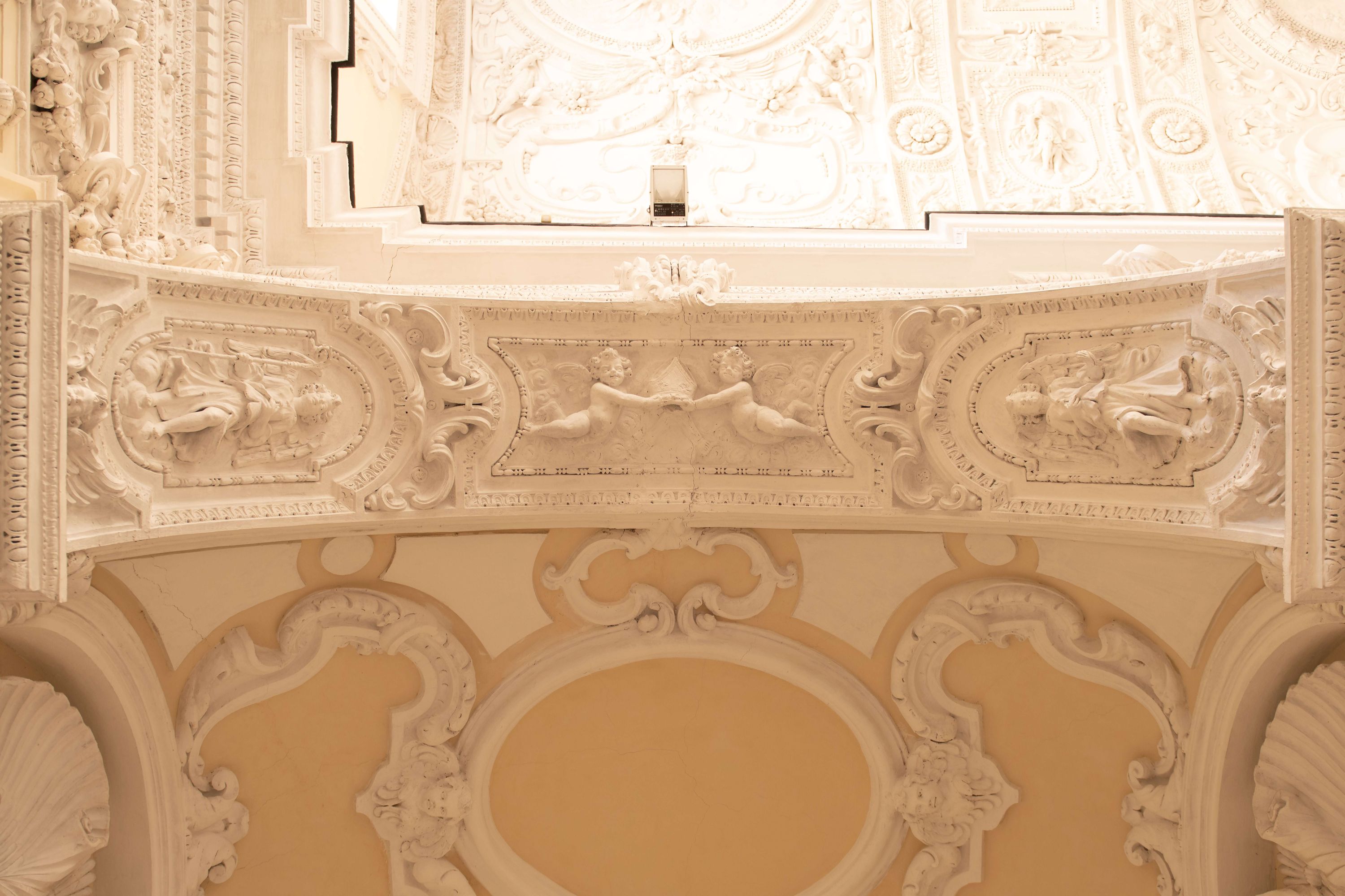 La volta del soffitto è ornata con decorazioni plastiche in rilievo: al centro una cornice ovale mentre ai lati cornici mistilinee arricchite in posizione apicale da teste di cherubino e racemi vegetali.Sulle pareti della cappella archi con valve di conchiglia mentre sull'intradosso dell'arco di ingresso alla cappella è presente una ricca decorazione. Nella cornice centrale due puttini reggono in volo la mitra mentre ai lati, entro cornici lobate, due angeli stanti, di cui uno regge il pastorale