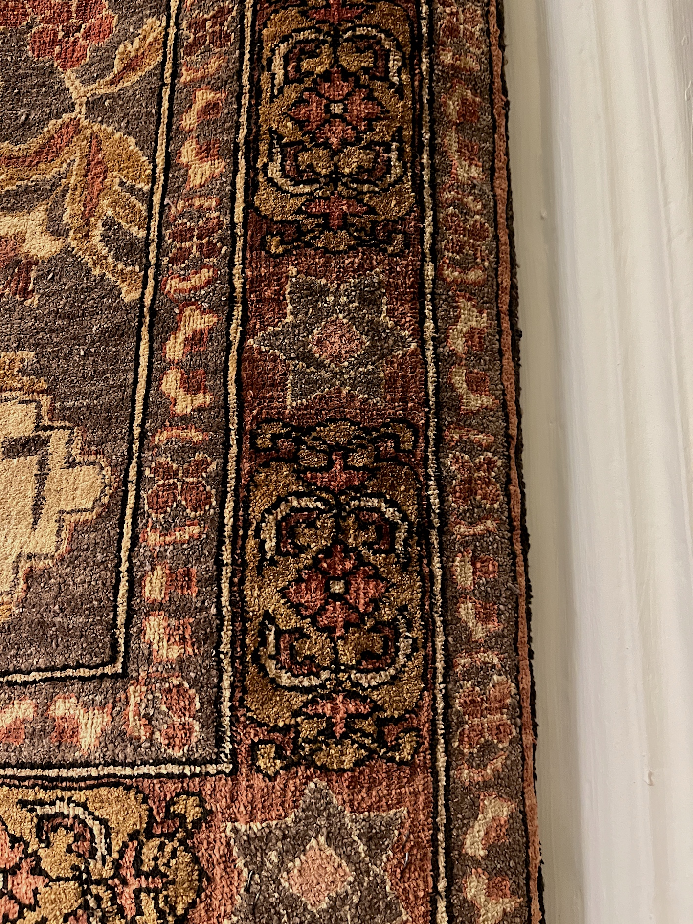 Tappeto da muro in lana e seta. Al centro cartiglio a fondo beige con iscrizione celebrativa affiancato da esili tralci di rami fioriti cui segue banda decorata a motivi floreali ed esternamente fascia decorata a motivi fitomorfi e stelle di David. Frangia in filo di seta color panna con gonna bicroma nei toni del rosso e del bianco corre sul bordo superiore e inferiore