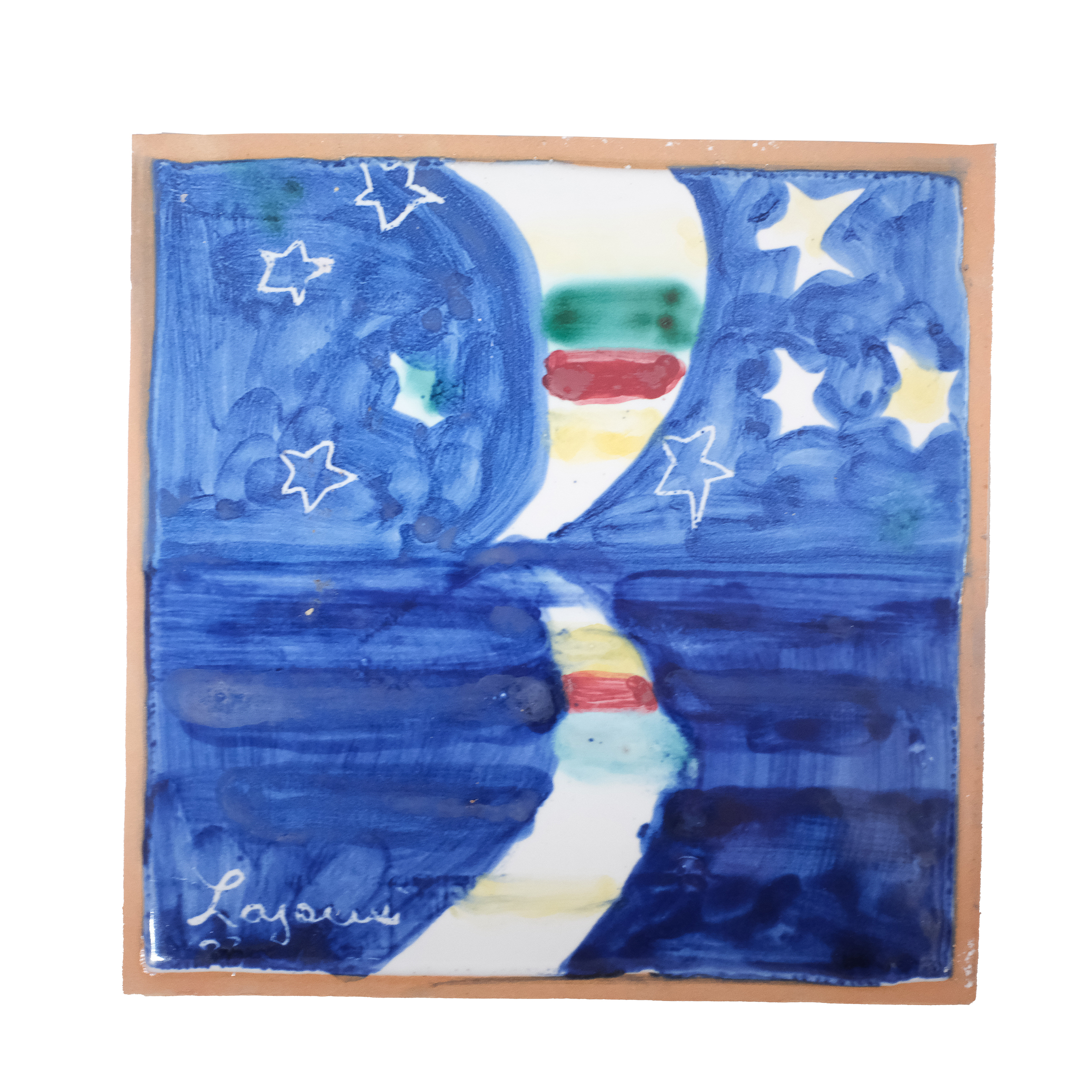 piastrella quadrata in cotto con decorazione a smalto. La decorazione è divisa idealmente in due metà: in quella superiore, il cielo, si vede la parte inferiore di uno spicchio di luna crescente e le stelle; nella parte inferiore si vede lo spicchio di luna riflesso nell'acqua. La luna è gialla e nella parte inferiore presenta due fasce orizzontali, una bruna e una verde. Il fondo è blu reso con lunghe pennellate orizzontali per il mare, pennellate piccole per rendere il cielo. In basso a sinistra la firma dell'autore "Laganà 03"