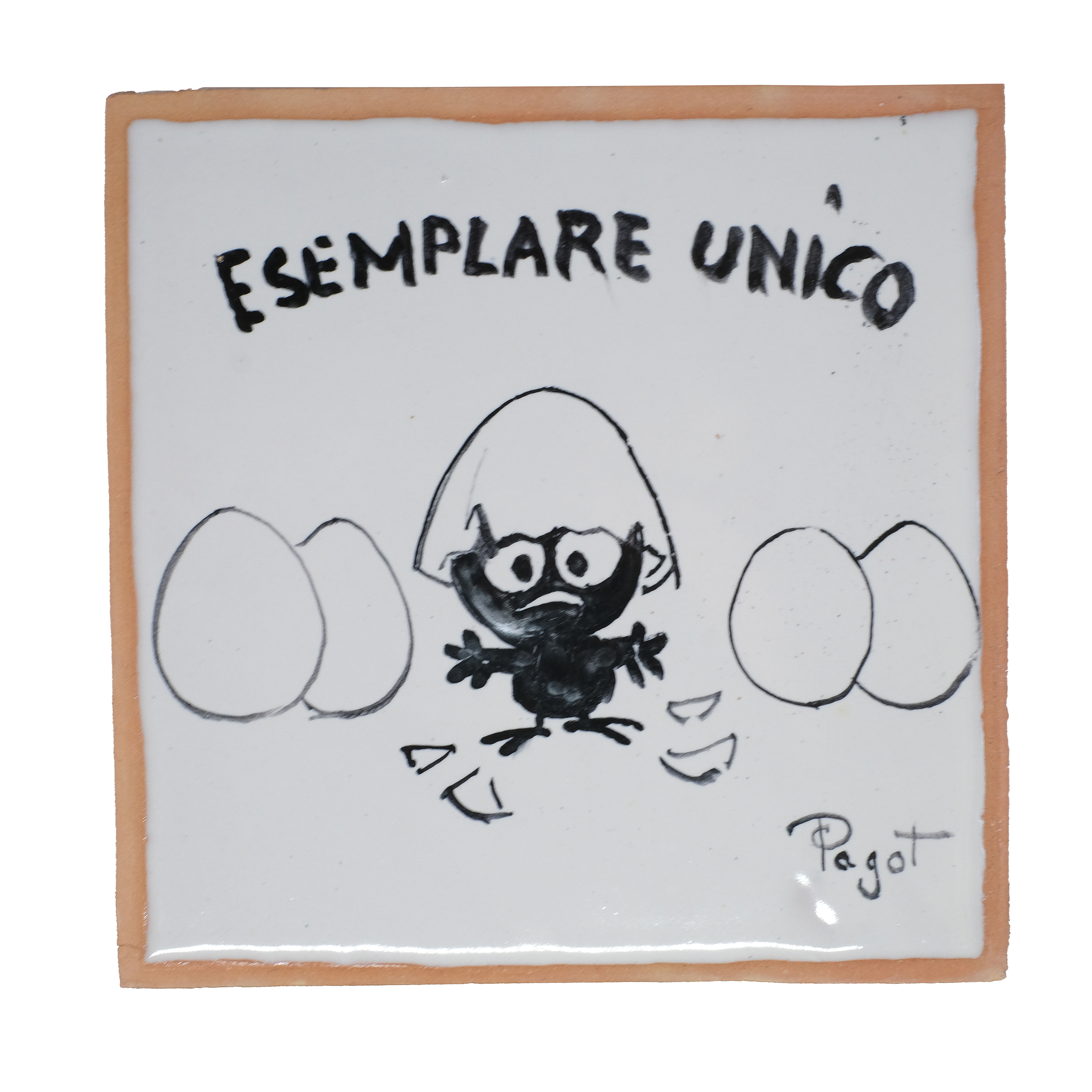 piastrella quadrata in cotto con decorazione a smalto. La decorazione raffigura al centro, tra due coppie di uova non schiuse, il pulcino Calimero, nero con guscio d'uovo bianco in testa. in alto in stampatello la scritta "ESEMPLARE UNICO"; in basso a destra la firma "Pagot"