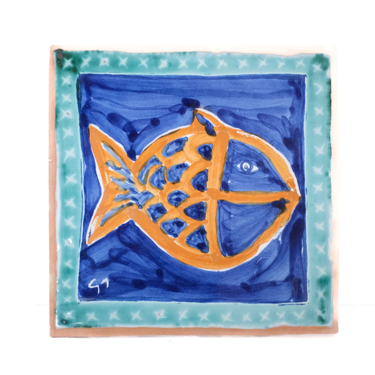 piastrella quadrata in cotto con decorazione a smalto. La decorazione rappresenta un pesce stilizzato, dal profilo arancione su fondo blu intenso. l'immagine è circondata da cornice quadrata in celeste con arricchita con crocette tutt'intorno. Siglata nell'angolo a sinistra con Gn