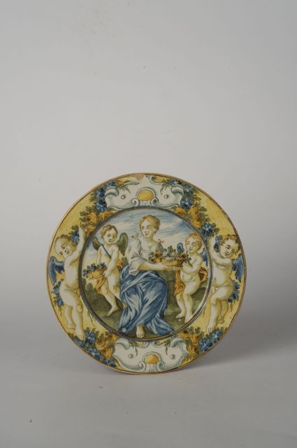 piattino. sulla tesa motivi vegetali e putti; sul fondo figura femminile fra due angioletti