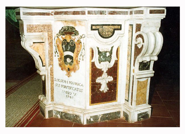 - ISCRIZIONI laterale sud, sotto lo stemma - D. IOSEPH MARRUCA/ SUI PONTIFICATUS/ ANNO V/ 1769 - lettere capitali - ad alveoli -
