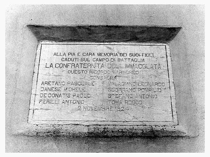 - ISCRIZIONI nello specchio epigrafico - ALLA PIA E CARA MEMORIA DEI SUOI FIGLI / CADUTI SUL CAMPO DI BATTAGLIA / LA CONFRATERNITA DELL'IMMACOLATA / QUESTO RICORDO MARMOREO / CONSACRA / A RETANO PASQUALE / DANESE MICHELE / DE DONATIS PAOLO / FERILLI ANTONIO / M ALAGNINO LEONARDO / SCORRANO POMPILIO / STEFANO ANTONIO / TOMA ROCCO / 2 NOVEMBRE 1924 - lettere capitali - a solchi -