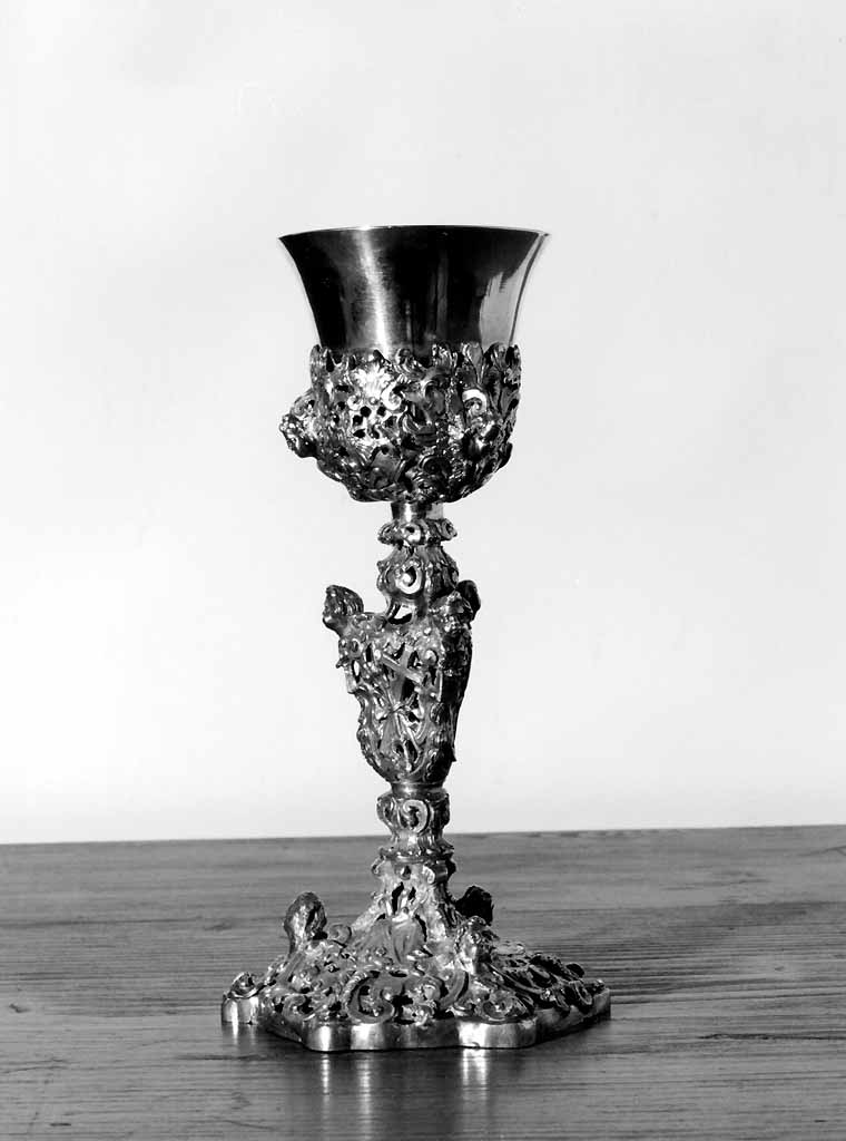 Piede sagomato con decorazioni vegetali e teste angeliche; fusto modanato a sezione circolare con nodo sagomato e testine angeliche; sottocoppa campaniforme decorata con motivo vegetofloreale e testine angeliche; coppa campaniforme con orlo estroflesso