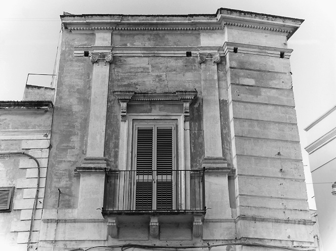La decorazione plastica del primo piano di questo palazzo consiste in paraste ioniche e nell'aggettante cornicione a dentelli del coronamento rettilineo