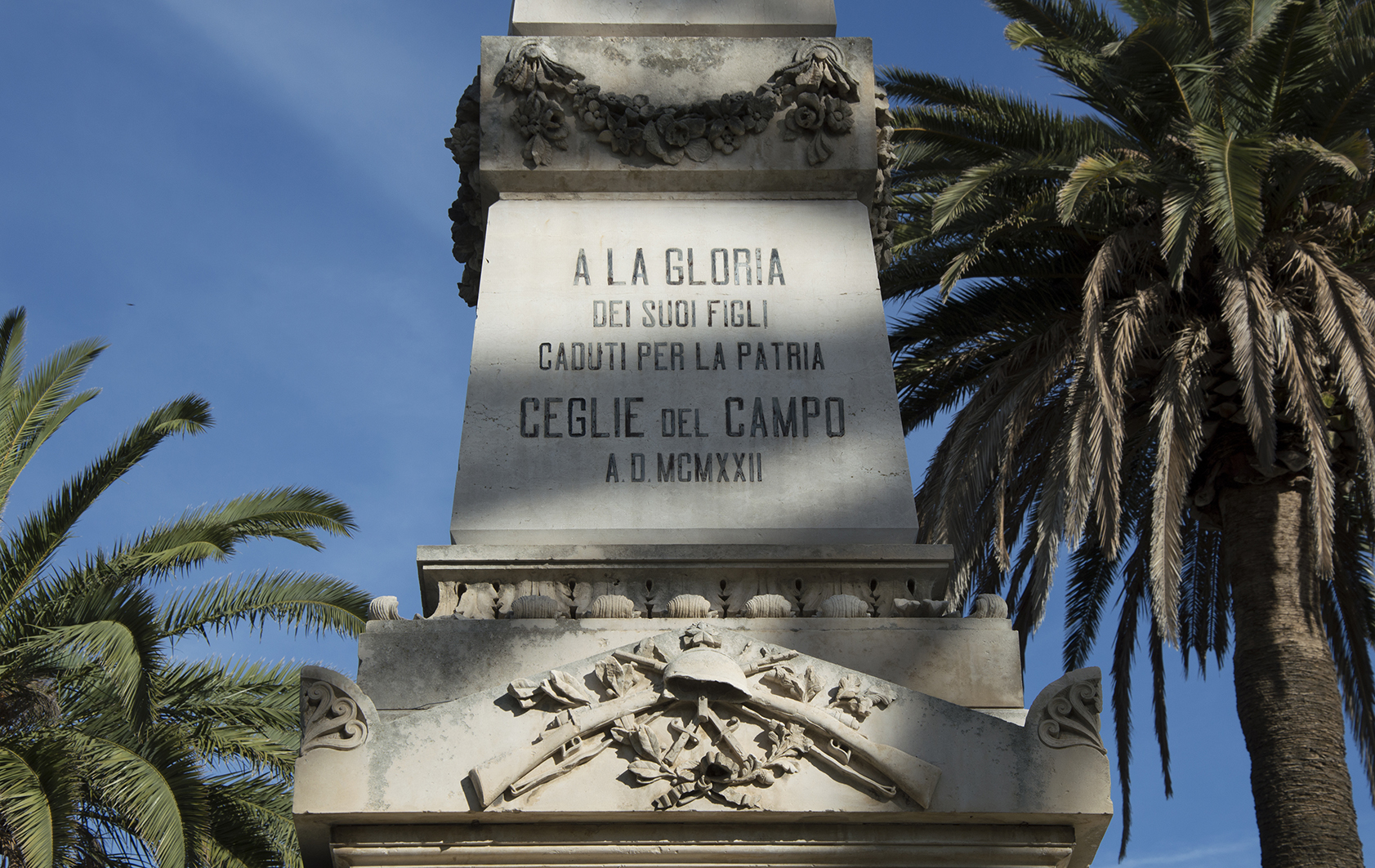 - ISCRIZIONI in direzione S - A LA GLORIA / DEI SUOI FIGLI / CADUTI PER LA PATRIA / CEGLIE DEL CAMPO / A.D. MCMXXII - capitale alto-basso -
