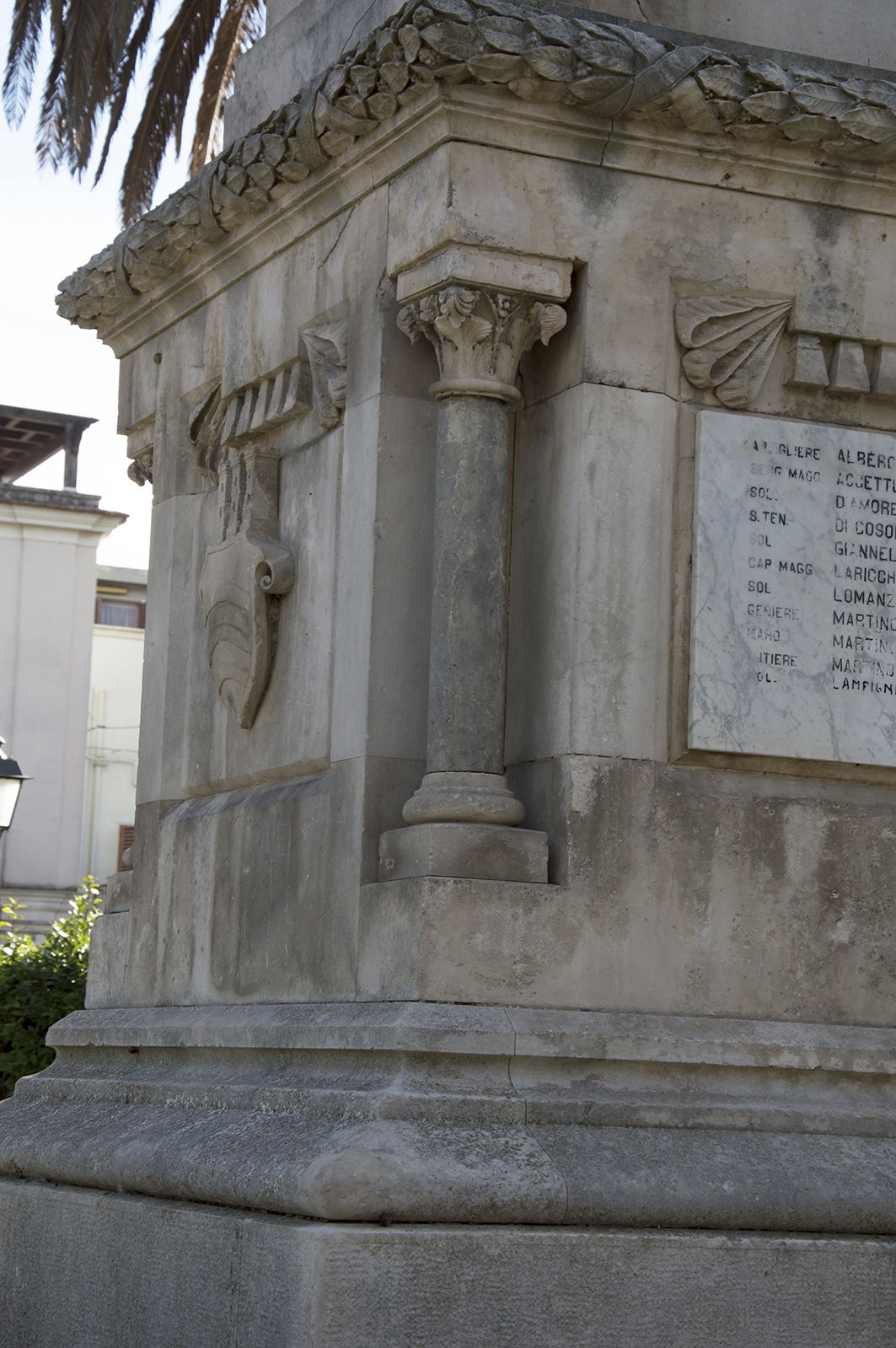 Monumento poggiante su basamento composto da due gradini. Alto dado a blocchi incrociati attorno a cui sono disposte le lapidi, agli spigoli colonnine in marmo grigio con capitelli fogliati. Sulla sommità alto obelisco intramezzato da blocchi con raffigurazioni scultoree in marmo