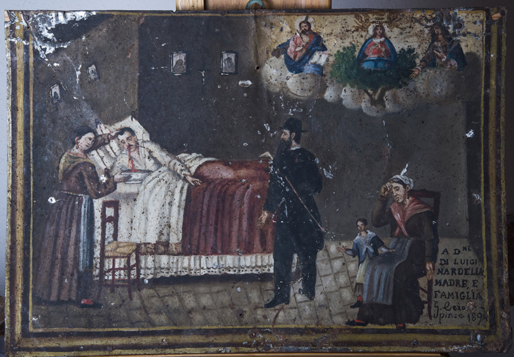 - ISCRIZIONI in basso a destra - A D.NE / DI LUIGI / NARDELLA / MADRE E / FAMIGLIA / G. CERA DI= / PINSE 1894 - capitale - a pennello - italiano
