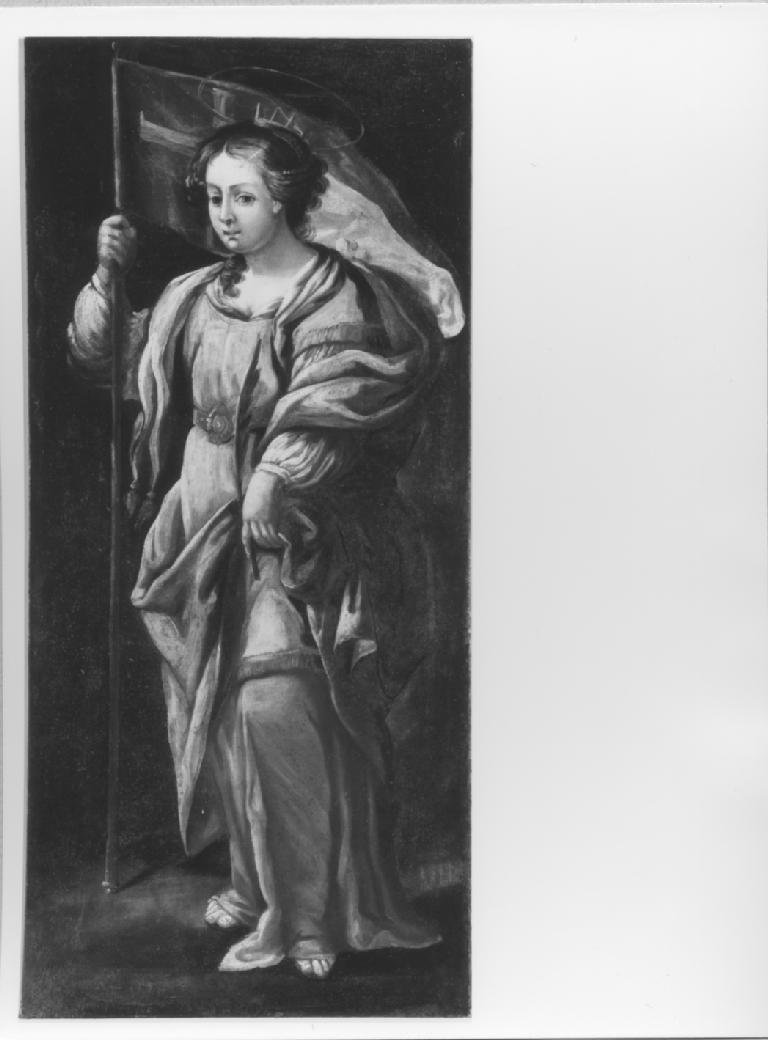 - NOTIZIE STORICO CRITICHE La tela ascrivibile ad artista meridionale vicino ai modi della cultura a rtistica napoletana, e' databile per gli elementi compositivi e formali d ella figura alla prima meta' del Settecento, sebbene permangano alcune ca ratteristiche che rimandano ad epoca precedente. La santa rappresentata c on lo stendardo e la corona, suoi attributi riconosciuti, e' identificabi le come Orsola, morta martirizzata