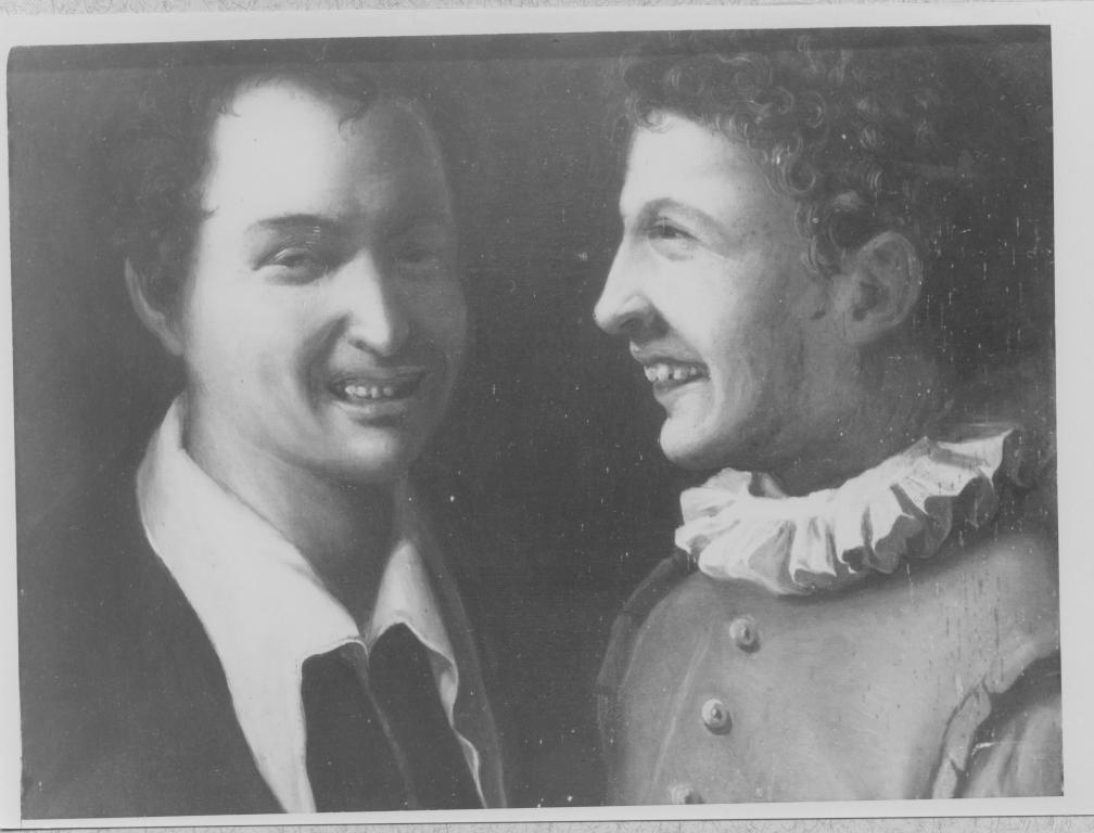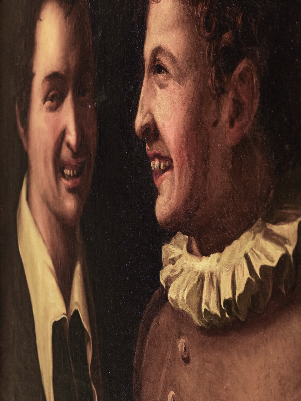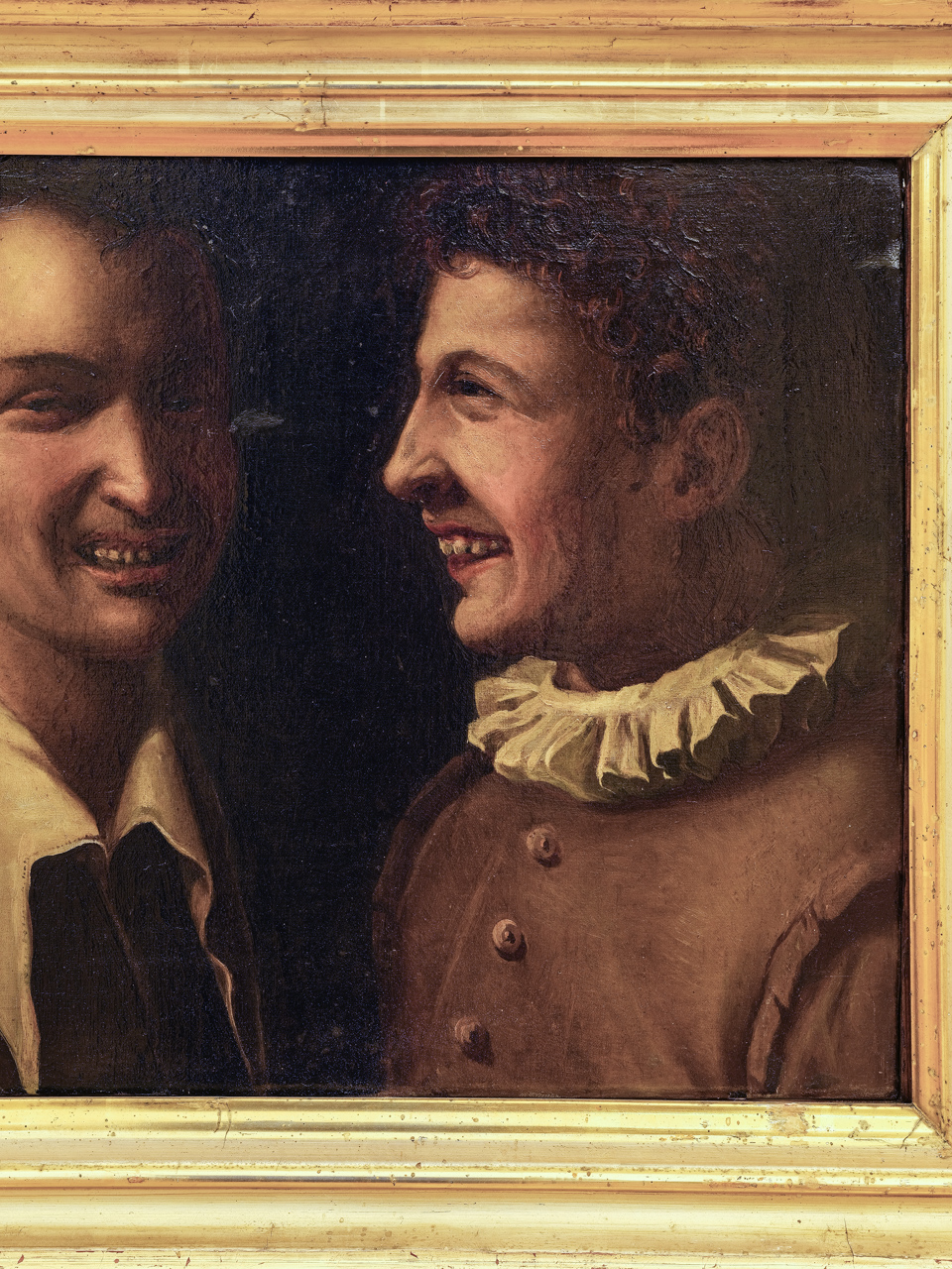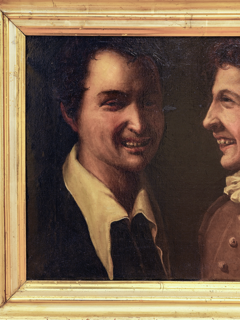 Dipinto a olio su tela, raffigurante due giovani che ridono, uno di tre quarti, l’altro di profilo