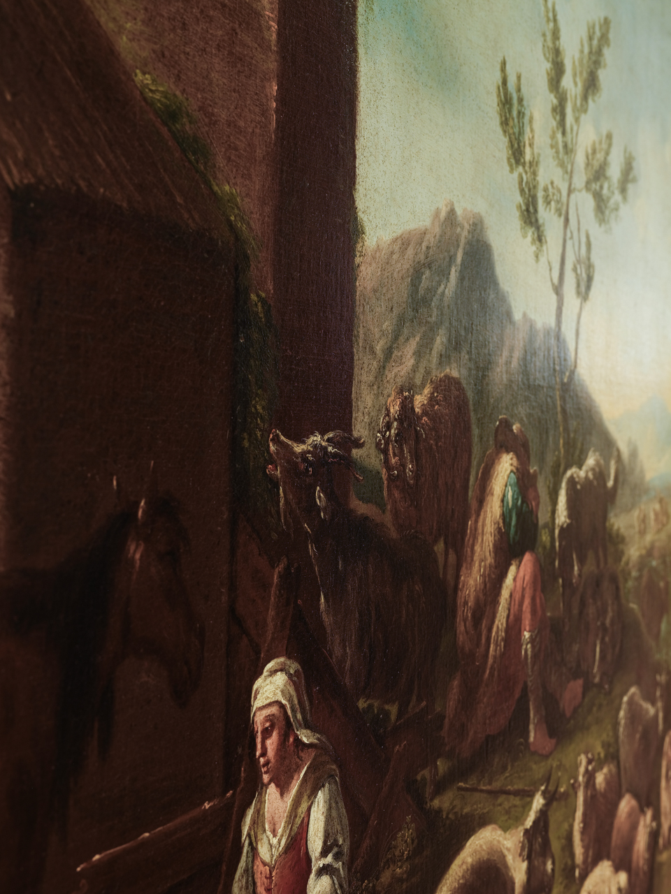 Dipinto a olio su tela, rappresentante una scena con figure, su sfondo paesaggistico