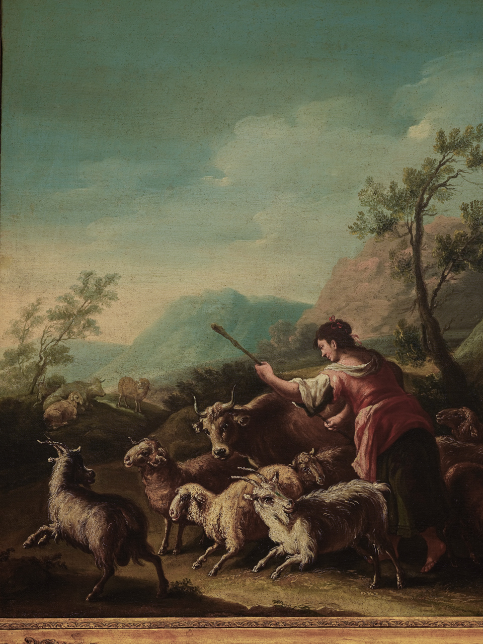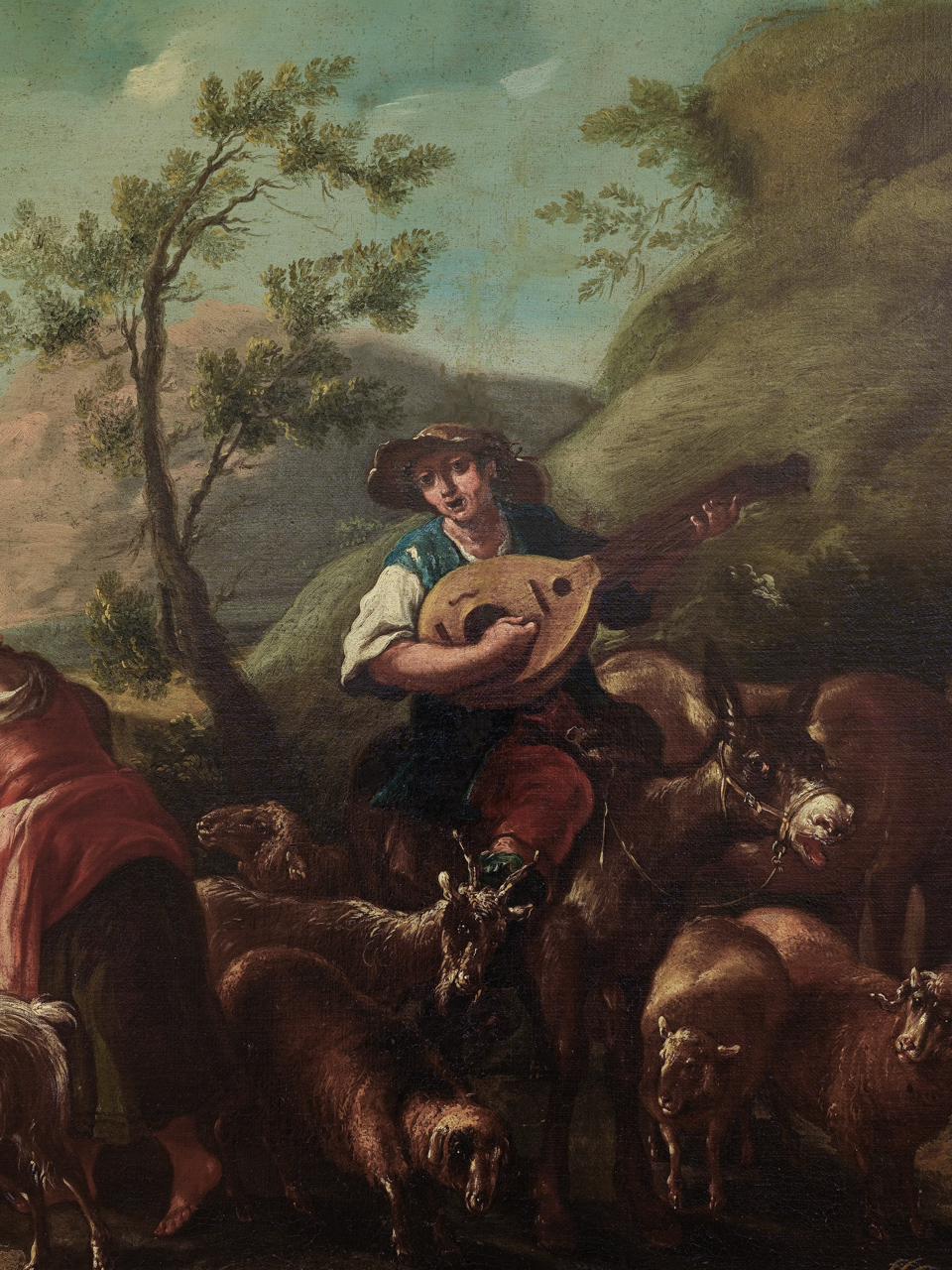 Dipinto a olio su tela, rappresentante una scena con figure, su sfondo paesaggistico