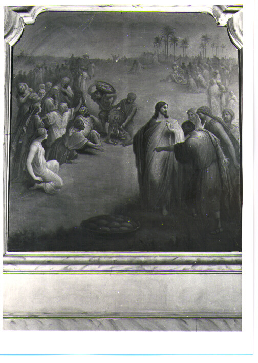 Mentre un gruppo di persone si assiepa a sinistra e sullo sfondo, Cristo campeggia in primo piano. Ai suoi piedi un cesto di pani