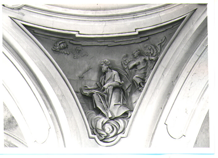 San Matteo su una nuvola con i suoi simboli; sullo sfondo: scrittoio; in alto: cherubini