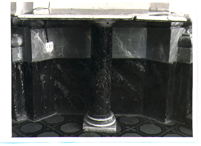 - NOTIZIE STORICO CRITICHE I due tavoli da muro risalgono con tutta probabilità all'epoca del Vescovo Michele Arcangelo Lupoli (1797-1818) o del suo successore, Vescovo Cassiodoro Margherita (1818-1851), quando fu sistemata la zona del presbiterio. Opera di fattura corrente di un ignoto marmoraro locale