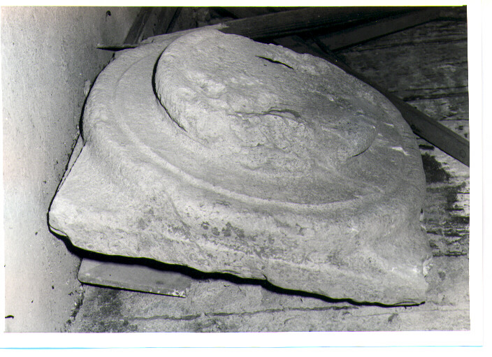 La base di colonna, a forma di parallelepipedo, reca agli angoli le cosiddette foglie protezionali. Sulla faccia superiore, al centro, modanatura torica circolare, in corrispondenza dell'inserzione della colonna