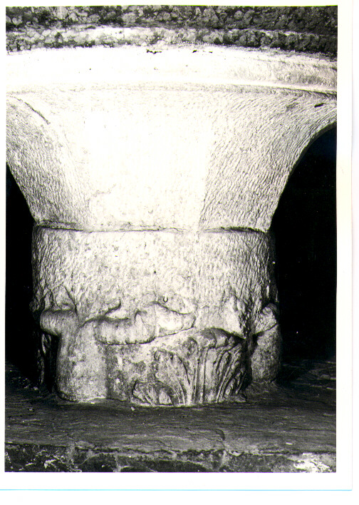 Base di fonte battesimale costituita da un capitello, segato a metà altezza e scalpellato nella parte superiore, raffigurante putti acefali allacciati nella danza, tra foglie di acanto. Sul capitello poggia un blocco sbozzato in forma di tronco di cono rovesciato, con cornice di coronamento