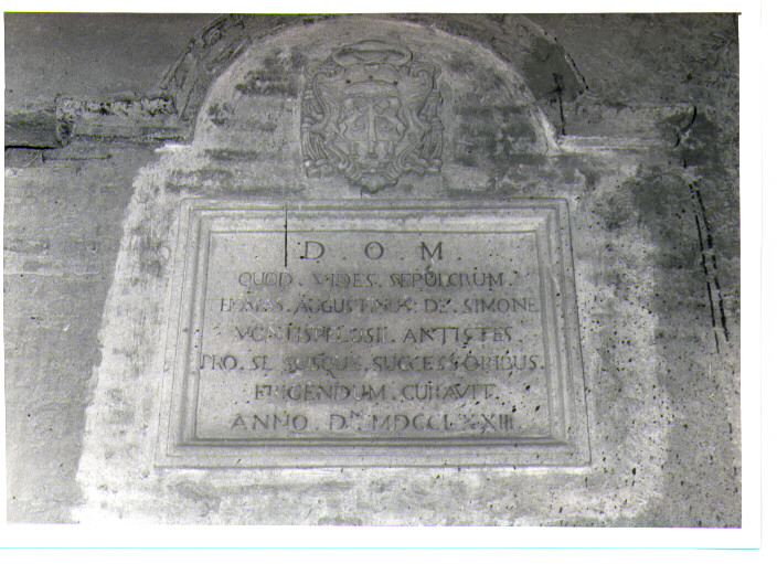 - ISCRIZIONI D. O. M. / QUOD VIDES SEPULCRUM / THOMAS AUGUSTINUS DE SIMONE / MONTISPELUSII ANTISTES / PRO SE SUISQUE SUCCESSORIBUS / ERIGENDUM CURAVIT / ANNO DOMINI MDCCLXXIII - lettere capitali - a incisione - latino
