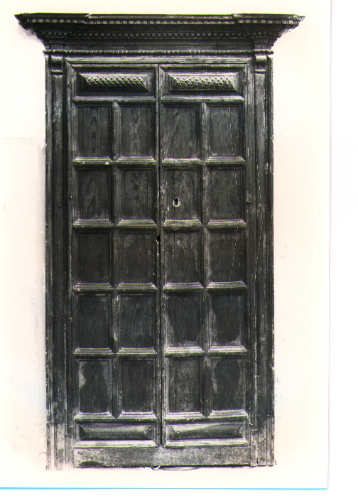 Porta formata da due ante divise in quadrati a bordi rilevati, con sottili lesene laterali; in alto, formelle a punta di diamante; sulla sommità, pesante cornicione ornato da fusarole e dentelli