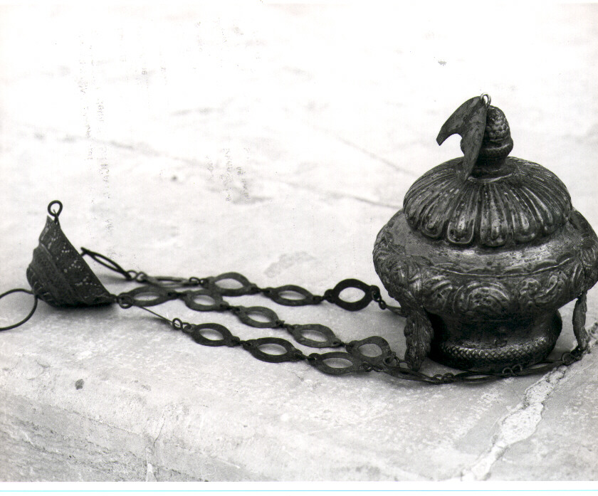 Coppa, leggermente espansa, decorata da baccelli, tralci, lobatura a losanghe; in basso una pigna sbalzata sorregge la targhetta votiva; il cupolino è collegato alla coppa tramite tre catenelle a maglie losangate