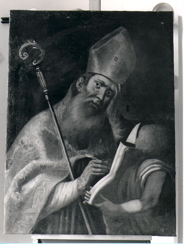 Il santo è rappresentato a mezza figura, in abiti vescovili ed in atto di scrivere su un volume retto da un angelo