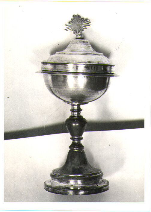 - NOTIZIE STORICO CRITICHE La pisside, a ridotte proporzioni, è un arredo di gusto neoclassico per la funzionalità strutturale e l'assenza totale di ornati. E' opera di uno sconosciuto argentiere di scuola partenopea, siglato. GD. Riporta il bollo di Stato con testina di Partenope e numero 5, "titolo di Piazza", usato per gli arredi d'uso comune e commerciabili, andato in vigore dal 1809 al 1823