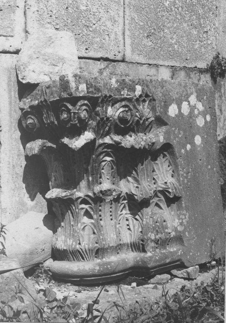 Il semicapitello è decorato da un doppio giro di foglie d'acanto spinoso alternate, nella parte inferiore, a mezze palmette. I profili delle foglie sono realizzati con piccoli fori di trapano. Superiormente coppie di caolicoli dal fusto scanalato terminano con volute circolari simili a boccioli