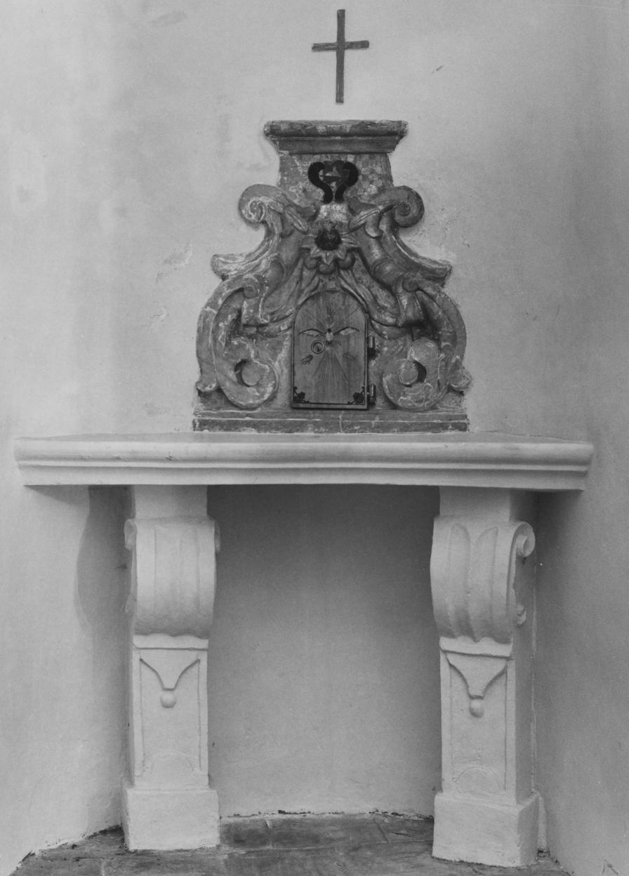 Il piccolo altare ha mensa semicircolare sostenuta da due pilastrini cuisi addossa mensola scanalata; su di essa poggia il tabernacolo in stuccodorato, incastrato nel muro, con prospetto delimitato da gioco di volutecontrapposte
