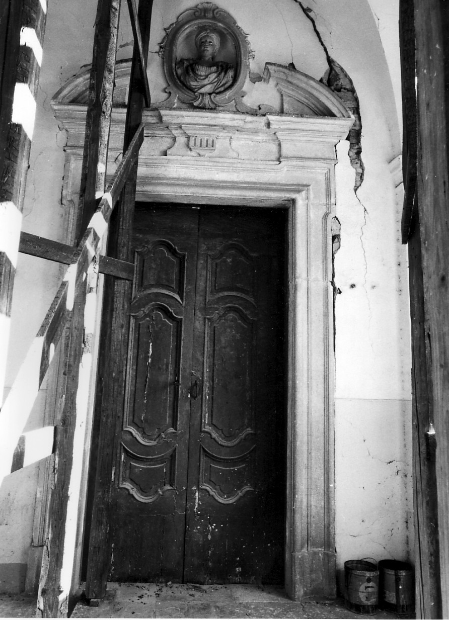 Mostra di porta in pietra con modanature a rilievo; timpano curvo spezzato ospitante una cornice ovale con mezzobusto femminile