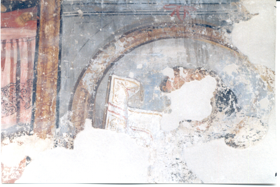 Di questa immagine è leggibile parte della nicchia che doveva contenere il santo, la parte alta della testa ed una bandiera, contraddistinta da motivi dorati