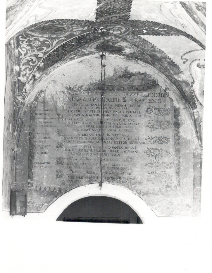 - ISCRIZIONI parete sud - (SONETTO SOPRA LE GRANDEZZE DELL'ORDINE DEL SERAFICO PADRE S. FRANCESCO)/ (CON) (CENTO OT)TANTA MILA HEROI MUNI(TO)/ 6 MILA CONV(ENTI)/ (IL) SE(RAF)ICO CAMPO AVERNO ASSA(LE)/ CHIOSTRI VENTI SEI MILA ERGE E PREVALE/ (...) (CIN)QUANTA E CENTO ARMA (PROVIN)CIE ARDITO/ (...) (SALGA A SIGN. CON CINQ)UE ALB(ERGHI IL SITO)/ (...) (CON 30 A BARBARIA SPUNJA) LO STR(ALE)/ (...) MILA MONAGHE (DUE CENTO E DIECIE MILA E IL SESSO FRALE (continua) - lettere capitali - a pennello - italiano volgare