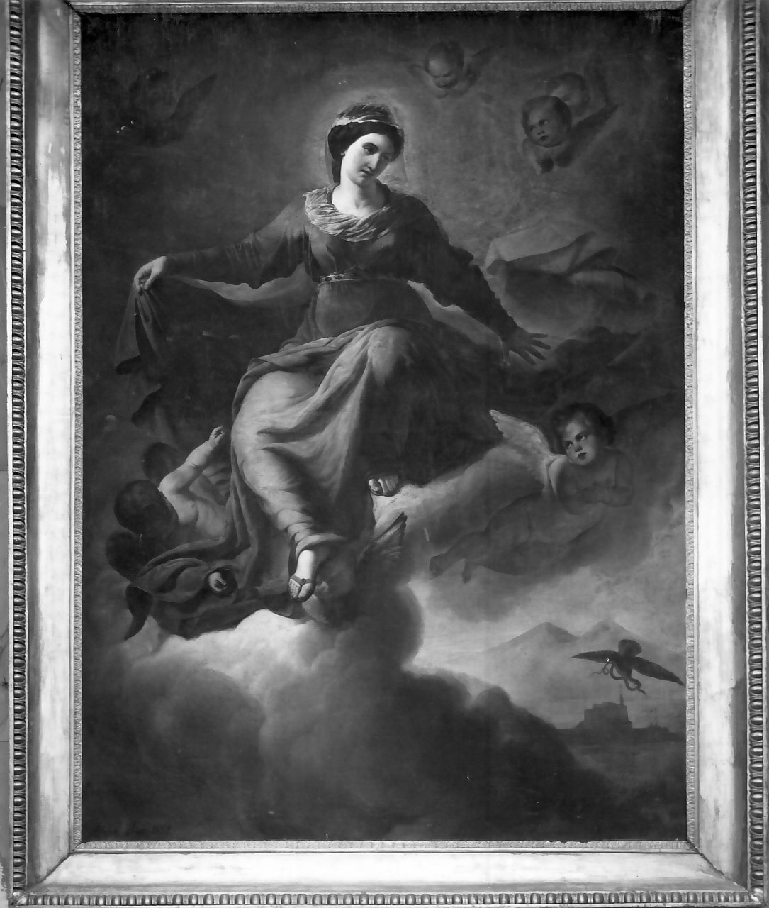 La Madonna, la cui figura copre gran parte del dipinto, è raffigurata sopra le nuvole sorrette da angeli e cherubini, ha una veste rossa fermata da una cintura con pietre preziose e un manto azzurro. In basso si vede un paesaggio marino, con veduta del Vesuvio e di Castel dell'Ovo: sopra vola un'aquila recante nel becco un serpente. Posto nella cappella a sinistra del transetto, il dipinto è contenuto in una cornice dorata