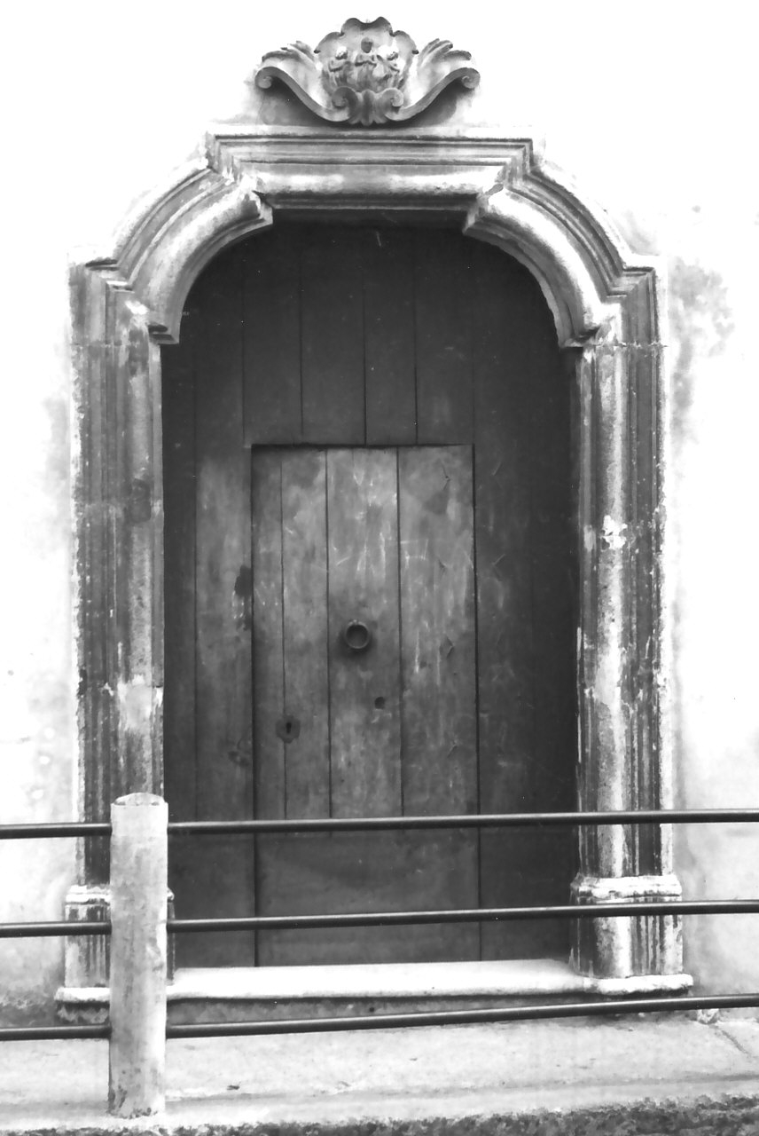 Portale in pietra grigia formata da semplici stipiti scanalati sorreggenti un architrave formato da una parte centrale orizzontale poggiante su due sezioni di arco. Al di sopra dell'architrave è murato un cartiglio raffigurante le anime del Purgatorio tra le fiamme