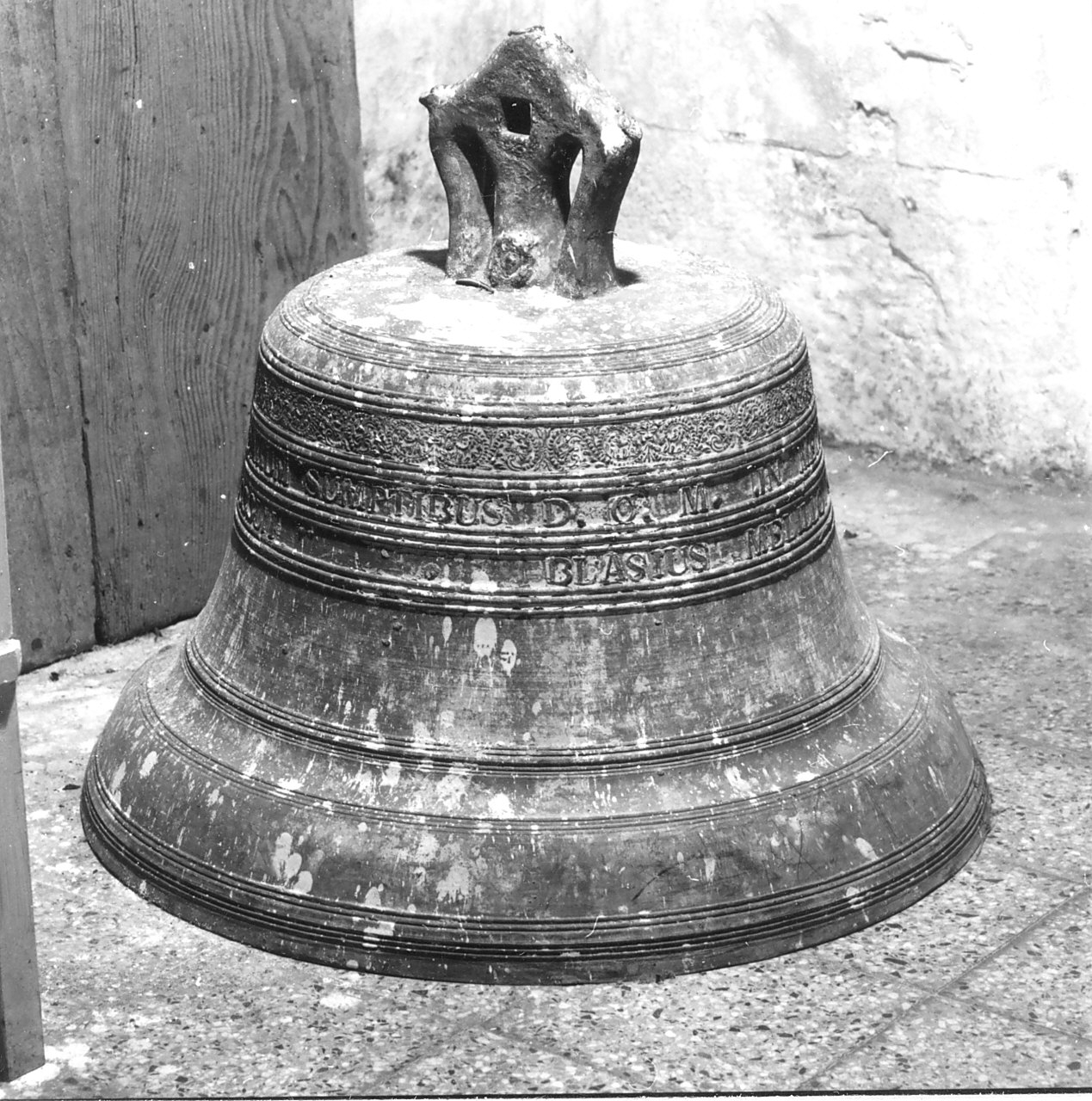 Campana in bronzo fuso ornata da semplici motivi concentrici. In alto fascia decorativa a rilievo con girali floreali; sotto iscrizione su due righe