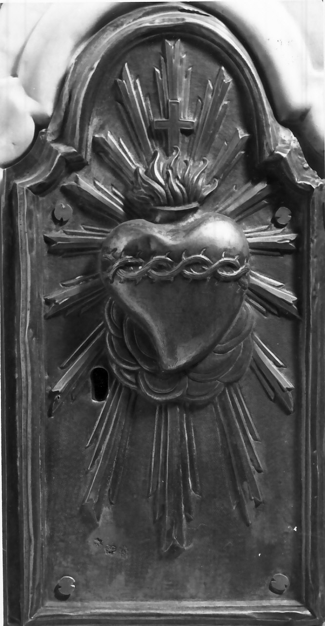 Rappresenta il cuore fiammante e raggiante imprigionato dalla corona di spine. Esecuzione a sbalzo e bulino; la cimasa è a profilo mistilineo, i contorni sono riquadrati da un rilievo lineare. Traacce di un'iscrizione a sinistra in basso