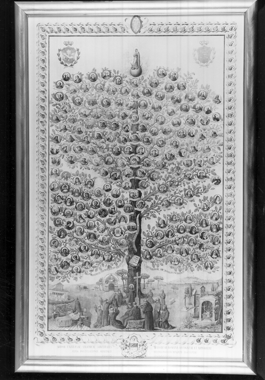 Stampa ad incisione raffigurante l'albero geneologico dei Santi Francescani