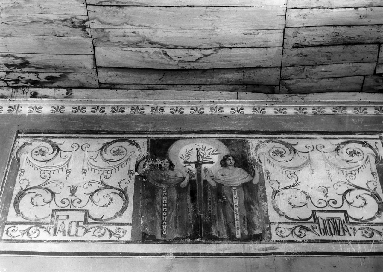 Figure femminili: allegoria della Pace; allegoria della Giustizia. Attributi: (allegoria della Pace) ramo di ulivo. Attributi: ( allegoria della Giustizia) bilancia. Simboli: spada con ramo di ulivo