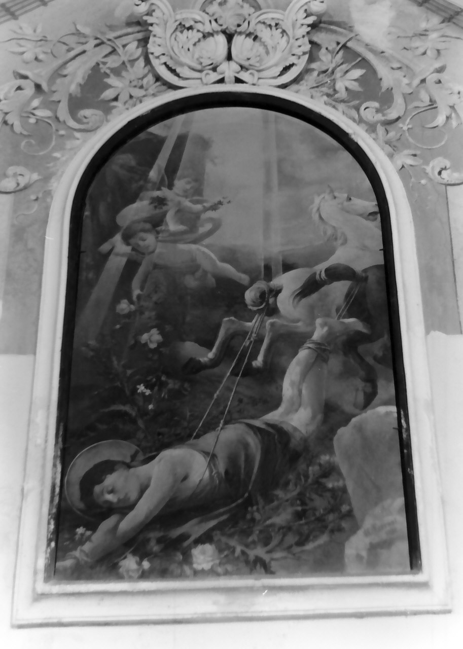 S. Ippolito trascinato da due cavalli, sullo sfondo due cherubini e un fascio di luce che colpisce il santo