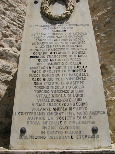 - ISCRIZIONI sulla lapide - PER LA PATRIA/ DAL 14 MAGGIO 1915 ALL’11 NOVEMBRE 1918/ PUGNANDO DA EROI/ CADDERO/ ATTADIA DOMENICO DI M. ANTONIA/ CANDIO VINCENZO FU GIOVANNI/ CONFORTI ANTONIO DI NICOLA/ DE MARCO GIUSEPPE DI VINCENZO/ DI LEO ERNESTO DI DOMENICO/ DI NUZZI FRANCESCO DI VINCENZO/ DONADIO ANTONIO DI MICHELE/ DONADIO FRANCESCO DI MICHELE/ GUIDO ANTONIO DI ROCCO/ MELE MAURIZIO DI CARLO/ MONTAGNA FILIPPO FU NICILA/ PACE IPPOLITO FU PROSPERO/ PUCCI DOMENICO FU PASQUALE/ RAGO GIUSEPPE DI VINCENZO/ RINA STEFANO DI GIUSEPPE/ TORCHIO NICOLA FU GIULIO/ TORCHIO VINCENZO DI LUIGI/ VITALE NICOLA DI LUIGI/ VITALE DOMENICO DI LUIGI/ VITALE FRANCESCO FU EGIDIO/ VIOLANTE ANDREA DI FILIPPO/ I CONTERRANEI EMIGRATI NEL NORD AMERICA/ AUSPICE LA SOCIETÀ DI M. S./ ROCCA IMPERIALE DI PHILADELPHIA/ I NOMI GLORIOSI/ IN QUESTO MARMO/ SCOLPISCONO CELEBRANO ETERNANO - maiuscolo - a caratteri applicati -