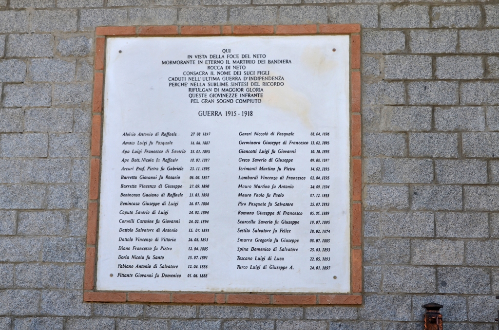 - ISCRIZIONI Lapide a sinistra - QUI/ IN VISTA DELLA FOCE DEL NETO/ MORMORANTE IN ETERNO IL MARTIRIO DELLA BANDIERA/ ROCCA DI NETO/ CONSACRA IL NOME DEI SUOI FIGLI/ CADUTI NELL’ULTIMA GUERRA D’INDIPENDENZA/ PERCHE’ NELLA SUBLIME SINTESI DEL RICORDO/ RIFULGAN DI MAGGIOR GLORIA/ QUESTE GIOVINEZZE INFRANTE/ PEL GRAN SOGNO COMPIUTO/ GUERRA 1915 - 1918/ ALOISIO ANTONIO DI RAFFAELE 27. 08. 1897/ AMATO LUIGI FU PASQUALE 16. 06. 1887/ APA LUIGI FRANCESCO DI SAVERIO 25. 01. 1895/ APE DOTT. NICOLA FU RAFFAELE 18. 03. 1887/ ARCURI PROF. PIETRO FU GABRIELE 23. 11. 1895/ BARRETTA GIOVANNI FU ROSARIO 06 .06. 1897/ BARRETTA VINCENZO DI GIUSEPPE 27. 09. 1890/ BENICASA GAETANO DI RAFFAELE 31. 01. 1898/ BENICASA GIUSEPPE DI LUIGI 26. 07. 1884/ CAPUTO SAVERIO DI LUIGI 24. 02. 1894/ CARVELLI CARMINE FU GIOVANNI 24. 02. 1894/ DATTOLO SALVATORE DI ANTONIO 15. 07. 1891/ DATTOLO VINCENZO DI VITTORIA 26. 08. 1893/ DIANO FRANCESCO FU PIETRO 12. 04. 1885/ DORIA NICOLA FU SANTO 15. 07. 1891/ FABIANO ANTONIO DI SALVATORE 12. 04. 1886/ FITTANTE GIOVANNI FU DOMENICO 01. 06. 1888 || GARERI NICCOLO’ DI PASQUALE 08. 04. 1896/ GERMINARA GIUSEPPE DI FRANCESCO 13. 02. 1895/ GIANCOTTI LUIGI FU GIOVANNI 10. 10.1895/ GRECO SAVERIO DI GIUSEPPE 09. 08. 1897/ IERIMONTI’ MARTINO FU PIETRO 14. 02. 1895/ LOMBARDI VINCENZO DI FRANCESCO 02. 04. 1895/ MAURO MARTINO FU ANTONIO 24. 09. 1894/ MAURO PAOLO FU PAOLO 07. 12. 1893/ PIRO PASQUALE FU SALVATORE 25. 07. 1893/ ROMANO GIUSEPPE DI FRANCESCO 05. 05. 1889/ SCARCELLA SAVERIO FU GIUSEPPE 19. 07. 1895/ SESTITO SALVATORE FU FELICE 18. 02. 1874/ SMARRA GREGORIO FU GIUSEPPE 08. 07. 1885/ SPINA DOMENICO DI SALVATORE 25. 03. 1893/ TOSCANO LUIGI DI LUCA 22. 05. 1893/ TURCO LUIGI DI GIUSEPPE A. 24. 01. 1897 -