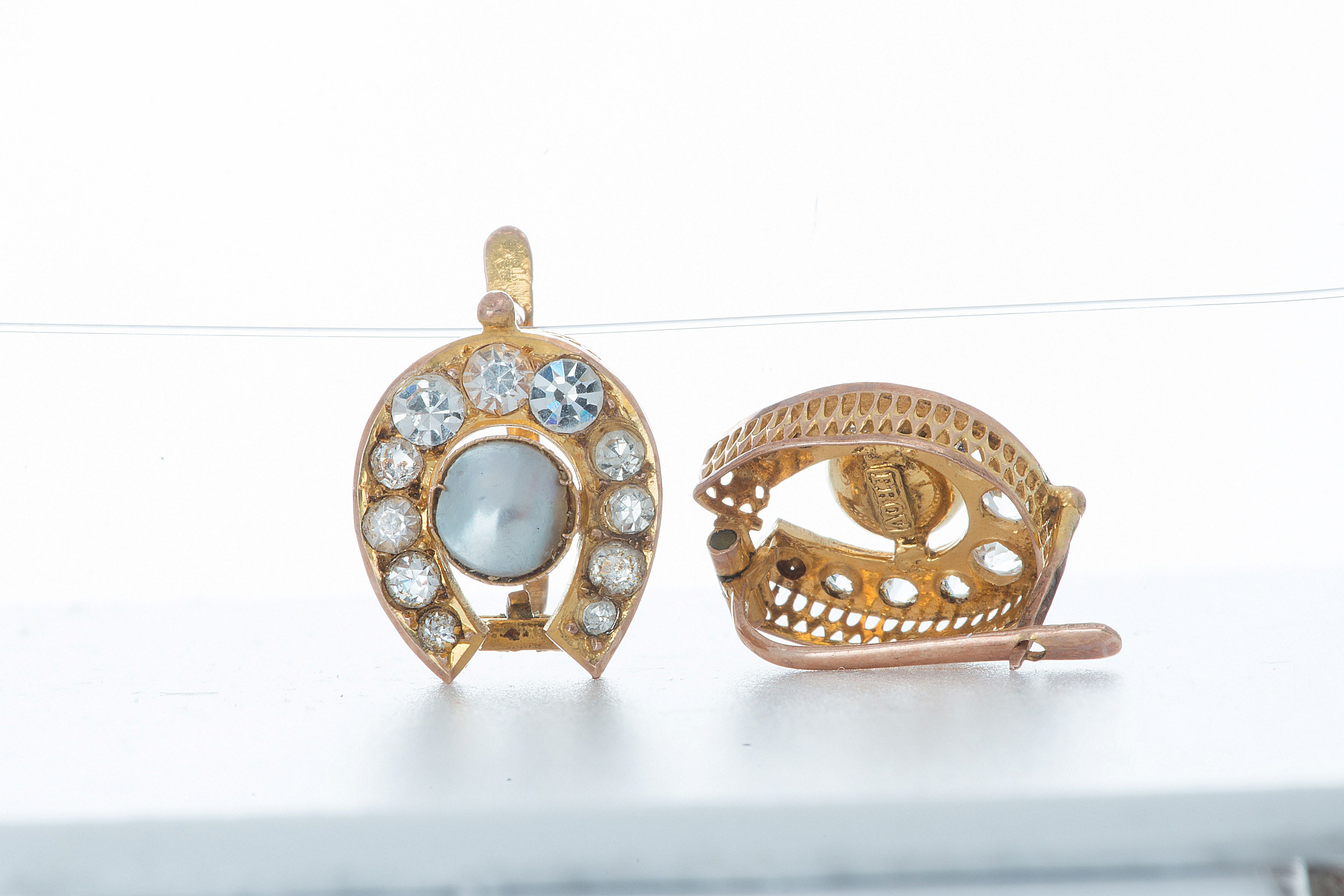 Orecchini in oro a bassa caratura a forma di ferro di cavallo, con madreperla e pietre a pasta vitrea incastonate a griffe, a giorno. Cestello della montatura traforato. Aggancio detto “alla napoletana”