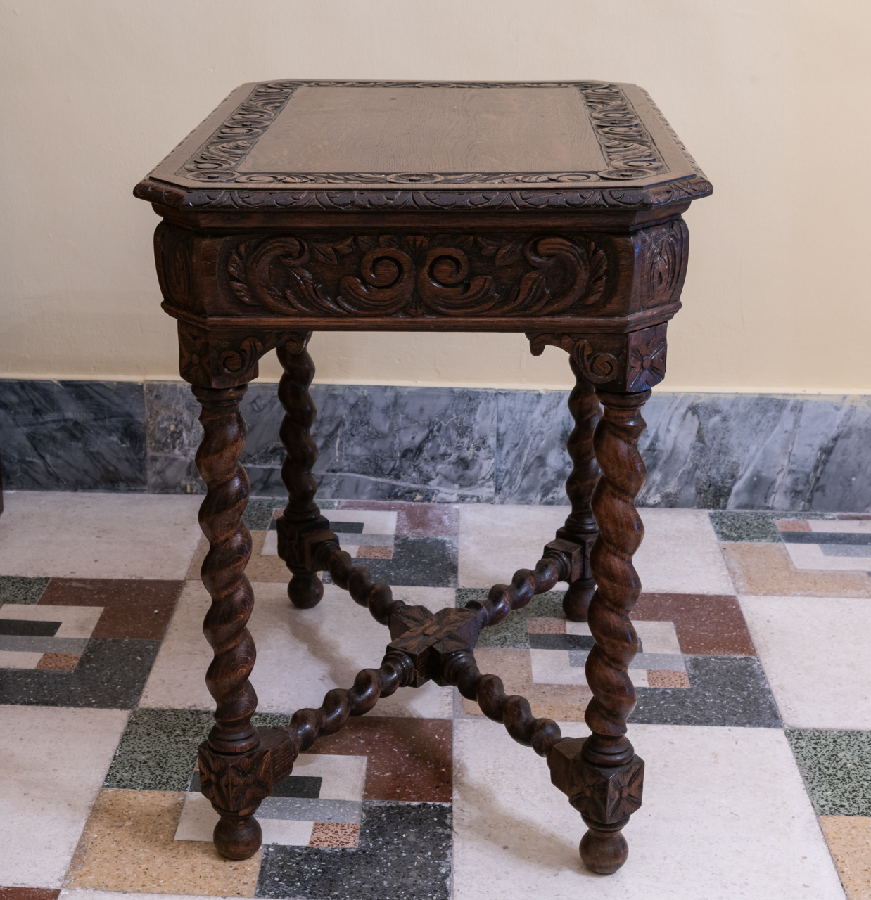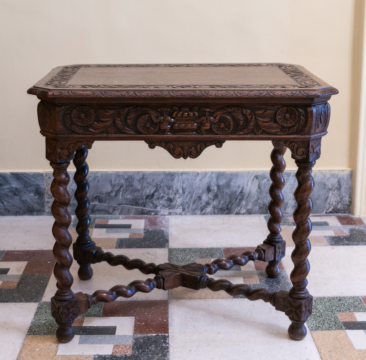 Lo stile tipico della Restaurazione inglese si evidenzia nelle forme di questo tavolino rettangolare. Una ricca decorazione a bassorilievo si snoda sulla fascia perimetrale del ripiano e sulla cintura dove ritroviamo accanto a motivi fitomorfi anche la figura umana. Le quattro gambe e le traverse a "X" che le raccordano, presentano il motivo a tortiglione