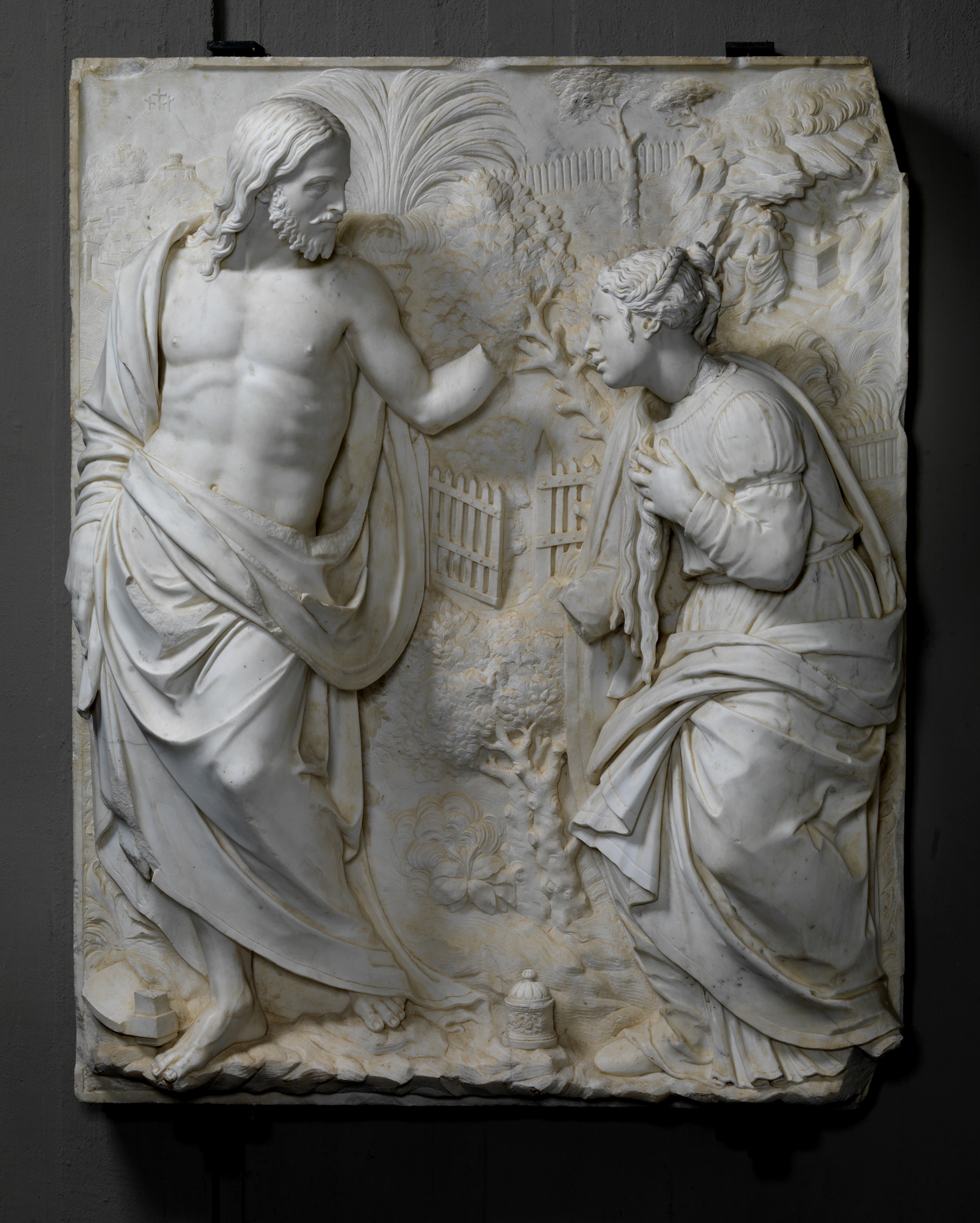 - NOTIZIE STORICO CRITICHE Il pannello ad altorilievo con la scena del Noli me Tangere era collocata nella chiesa di San Domenico distrutta da un incendio del 1848. Molti reperti, come la lunetta della Trinità, furono portati al Museo civico e dopo il terremoto di Messina del 1908 transitarono nella spianata del San Salvatore dove sorse il museo Nazionale, oggi Regionale Maria Accascina. L’opera è riconducibile per le evidenti qualità stilistiche all’arte del Montorsoli, il quale realizzò secondo il Vasari la statua dell'Immacolata della cappella Cicala nella stessa chiesa di San Domenico. L’attribuzione al seguace di Michelangelo, presente a Messina dal 1547 al 1557, è confermata da specifiche qualità stilistiche come la peculiarità dell’iride scavata dentro una sclera alquanto ricurva. La lavorazione ardita in direzione contraria della lastra marmorea, come nella Trinità ricondotta al maestro toscano, rivela le capacità dell’autore di saper trattare lo spessore scavando in profondità facendo emergere il volume quasi a tutto tondo dei soggetti primari. Inoltre si evince la maestria dell’artista nell’utilizzo della tecnica del bassorilievo e dello stiacciato sul fondo interamente scolpito. L’armoniosa impostazione della figura del Cristo è rispondente a quella del Salvatore benedicente nella chiesa della Santissima Annunziata a Firenze, eseguita dall’artista tra il 1536 e il 1546. Inoltre l’elegante plasticismo e la fisionomia della sacra immagine ricordano ancora il Risorto nell’altare maggiore della Basilica di Santa Maria dei Servi a Bologna, realizzato successivamente all’opera messinese. I protagonisti, come tutti i personaggi montorsoliani, sono caratterizzati da una forte empatia e connessione. La gestualità equilibrata e l’espressività del viso esprimono un linguaggio attento, che si sofferma sulla ricerca della lettura delle emozioni. La costruzione volumetrica della Maddalena si uniforma a quella frontale di Gesù, creando una assonanza visiva nello sviluppo dell’intera opera. La stessa impostazione percettiva voluta nella Trinità in cui il Padre e il Figlio sono posti sullo stesso piano emozionale e spirituale, si avverte nel pannello scultoreo del Noli me tangere, dove ambedue le figure appaiono completamente interconnesse. Lo struggimento della donna rivela un profondo coinvolgimento emotivo rivolto al Redentore, espresso dalla mano sul cuore e dall’espressione amorevole e languida del suo volto. Dal lato opposto l’attenzione si centra sulla maniera gentile del Cristo risorto, il quale si rivela nella sua nuova natura e dimensione a colei che viene scelta come prima testimone del miracoloso evento. Anche la natura raffigurata è collegata alla caratterizzazione della figura divina attraverso significati allegorici. I protagonisti sono inseriti in un giardino con piante simboliche, come la palma che si erge dietro la figura del Cristo, un segno polimorfo che nelle antiche culture è riferito alla luce e alla rigenerazione. Un simbolo religioso che nella Sacra Scrittura rimanda alla lealtà e nel vangelo di Giovanni indica la vittoria di Gesù sulla morte e la sua risurrezione. Nel giardino si notano anche due querce dal tronco nodoso e con il frutto di ghiande tra le folte chiome. L’arbusto incarna valori universali come la forza vitale e creativa. E’ inteso anche come un ponte tra la sfera spirituale e quella fisica che facilita il flusso e la canalizzazione dell’energia cosmica nell’esistenza terrena. Per le civiltà antiche era una pianta sacra di grande potere energetico e di divinità. Un’altra pianta presente è l’ulivo che è archetipo del rinnovamento, del cambiamento, della rinascita, della pace e della rigenerazione a nuova vita. In primo piano è anche scolpito un fiore d’iris che è segno del Cristo poiché simboleggia la speranza e la connessione tra Dio e l’umanità. L’artista, oltre a rappresentare il brano tratto dal vangelo che occupa l’intero pannello, ha riservato una parte della scena ad uno breve scorcio di una veduta urbana, posta sotto il monte Calvario. Forse lo scultore ha voluto ricordare un avvenimento importante di rinnovamento e di rinascita per Messina, relativo ai lavori di ampliamento e ricostruzione della cinta muraria avviati nel 1537 per volere di Carlo V. L’incarico venne affidato all’ingegnere Antonio Ferramolino che si avvalse della collaborazione di Francesco Maurolico e dello stesso Montorsoli. Per rafforzare il un nuovo sistema difensivo furono costruiti anche i forti Gonzaga e Castellaccio. L’ambientazione incentrata su un’altura sormontata da un castello potrebbe presumibilmente fare riferimento ad una delle due fortezze strategiche per il controllo della città, realizzate negli anni '40 del Cinquecento, mentre la porta turrita di ingresso alle mura, che circondano chiese e campanili, potrebbe essere un citazione alla struttura architettonica a cui il maestro fiorentino lavorò