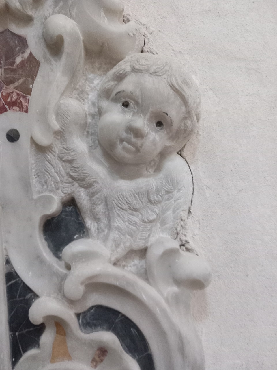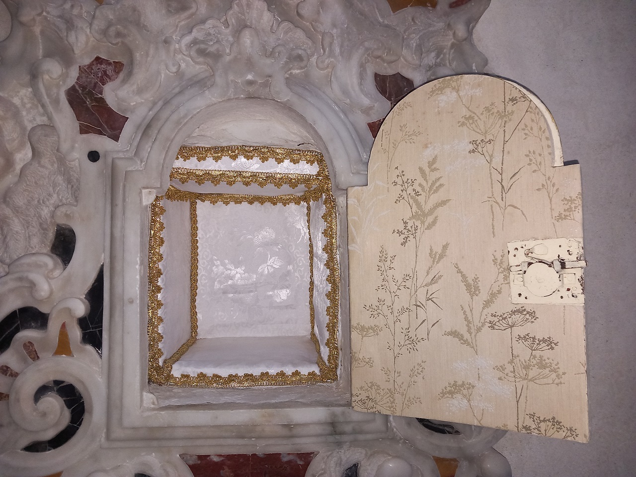 Tabernacolo a muro con ampia mostra a sagoma mistilinea in marmo bianco intagliato e a commesso con decorazioni a volute e foglie stilizzate. Al vertice superiore e al centro del lato inferiore due valve di conchiglia di cui quella inferiore con interno lavorato a commesso con marmi policromi. Ai lati si affacciano, simmetricamente, due teste di cherubini alati. Al centro della mostra in marmo si apre la nicchia interna chiusa da sportellino ligneo centinato con superfice decorata a bassissimo rilievo con vaso centrale dorato, argentato e inciso da cui fuoriescono simmetricamente racemi fioriti dorati e incisi su fondo scuro