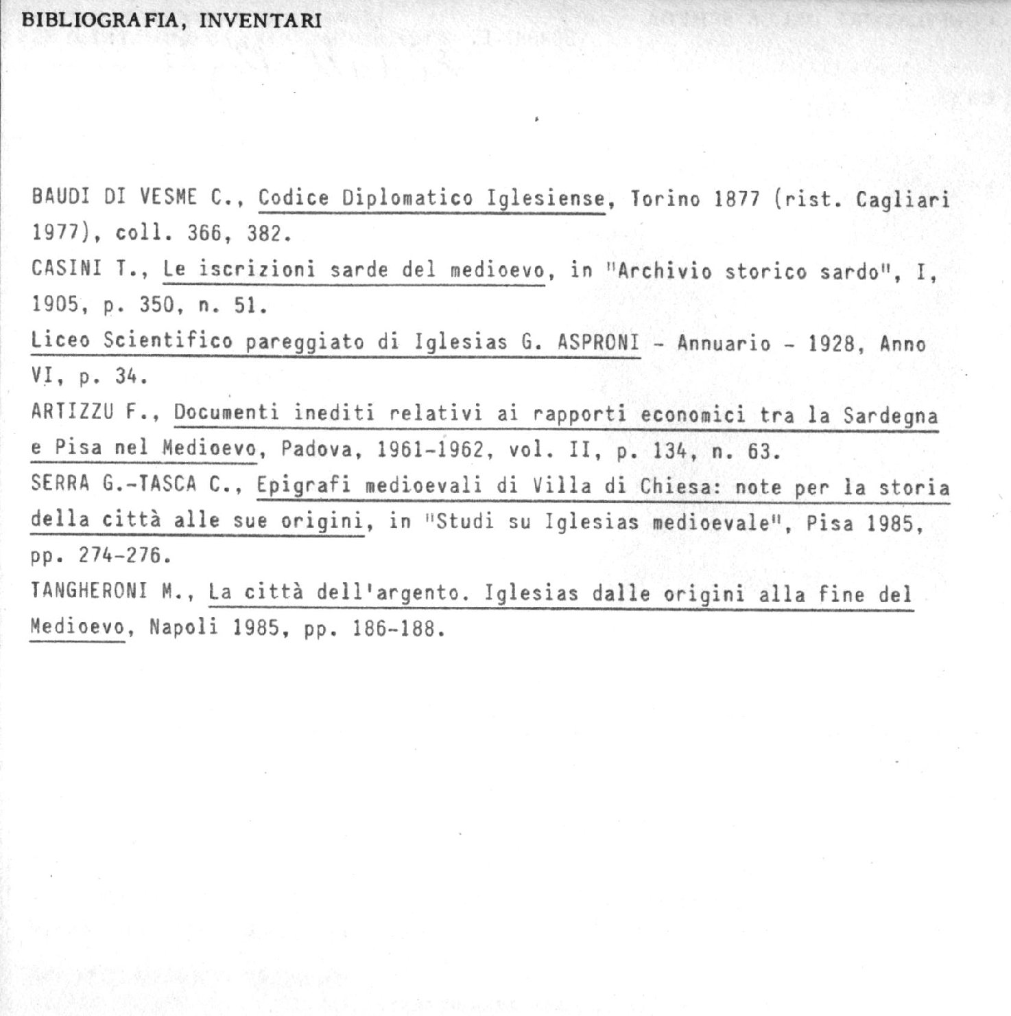 - NOTIZIE STORICO CRITICHE Datata secondo lo stile dell'incarnazione pisana: nel maggio 1323 va letto il maggio 1322. In alcuni documenti dell'Archivio di Stato di Pisa (1322-1324) Donato Seccamerenda e Giovanni Bellona figurano rettori della città di Iglesias, e Guglielmo de Orlandis giudice ed assessore nella medesima (BAUDI DI VESME 1877; ARTIZZU 1961). Essendo documentato Ciolo Fermentino come mercante pisano in Iglesias (TANGHERONI 1985), e riconosciuto nel Bencivenni quel Tebaldo consigliere del comune nel 1320 (SERRA-TASCA 1985), si esclude che gli stessi possano essere designati come 'operarli' del manufatto a cui l'iscrizione era in origine destinata. Nella riga nove leggesi 'MUTO' e non 'NUTO', concordemente alla lectio manoscritta di S. Pintus, citata da T. Casini
